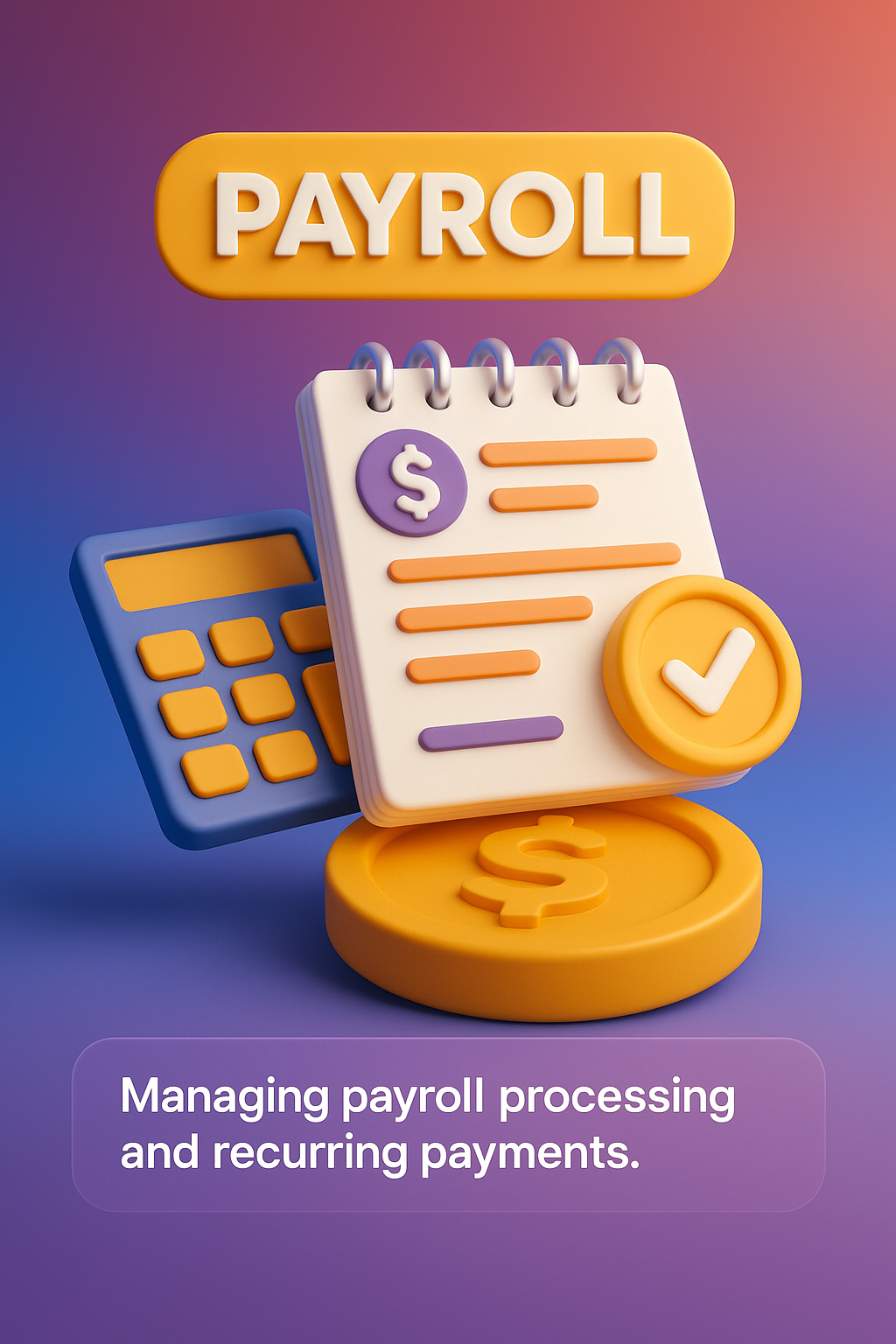 A colorful 3D illustration featuring payroll elements like a calculator, notes, and checkmarks, ideal for finance-related content or advertising payroll services.