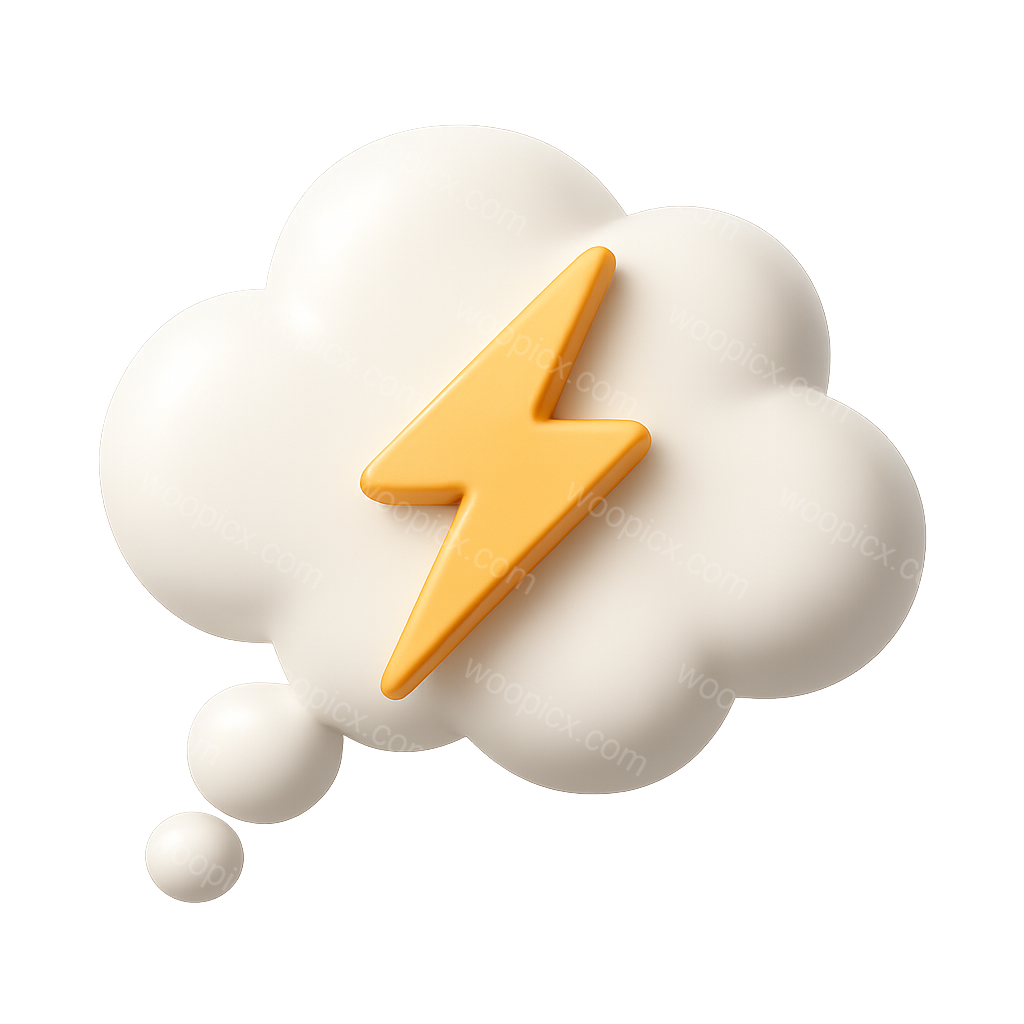 A 3D icon depicting a thought cloud with a striking yellow lightning bolt. The design features a transparent background and is presented in a three-quarter view, enhancing its volumetric appearance.