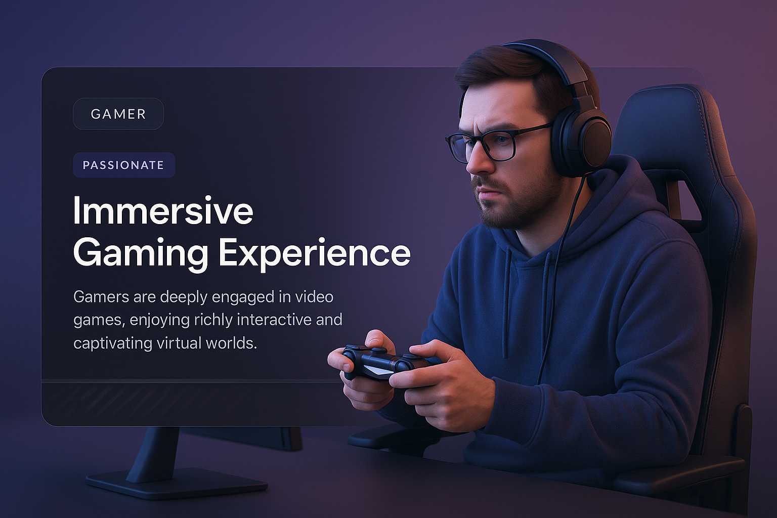 /Collection: /by davooda/Type: PNG/A 3D visual representation of a gamer deeply engaged in video gaming. It features a dark overlay with text blocks and dynamic graphics, creating an immersive atmosphere.