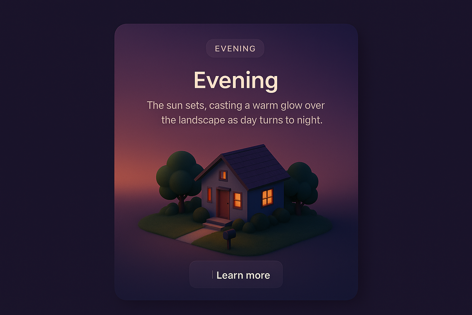 A beautifully crafted 3D scene depicting a cozy house at sunset, surrounded by soft greenery. The warm glow enhances the evening atmosphere, inviting viewers to engage.