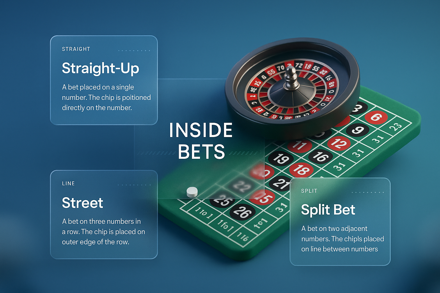 A modern 3D web design showcasing an inside bets layout. The image features a roulette wheel, a betting table, and clear descriptions of betting options, all integrated within a cohesive design.