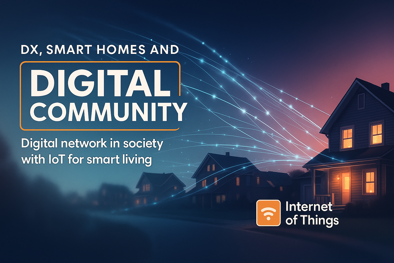 /Collection: /by davooda/Type: PNG/A captivating night scene featuring suburban houses illuminated with smart lighting. Data transactions flow visually, symbolizing the Internet of Things and digital community.
