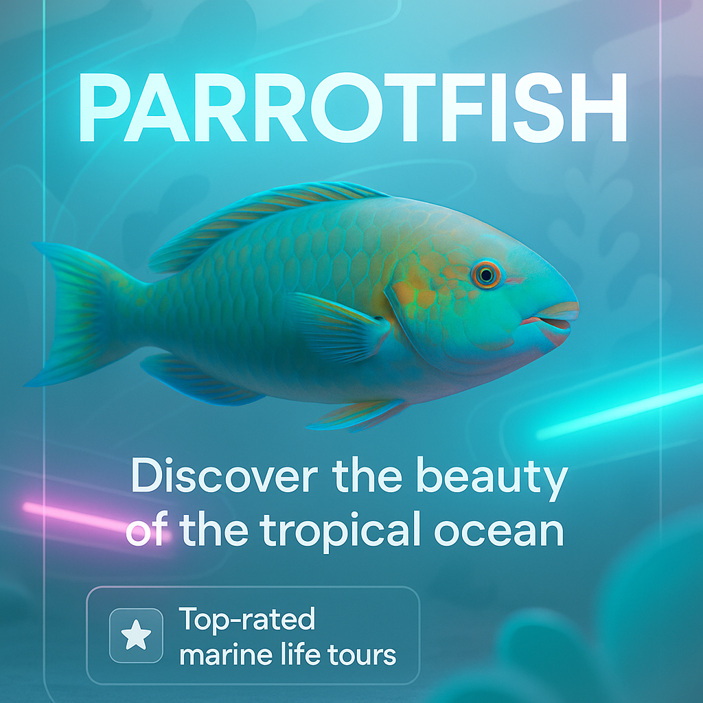 /Collection: /by davooda/Type: PNG/A captivating carousel slide featuring a parrotfish, showcasing the beauty of the tropical ocean. The design incorporates neon elements and layered visuals for depth.