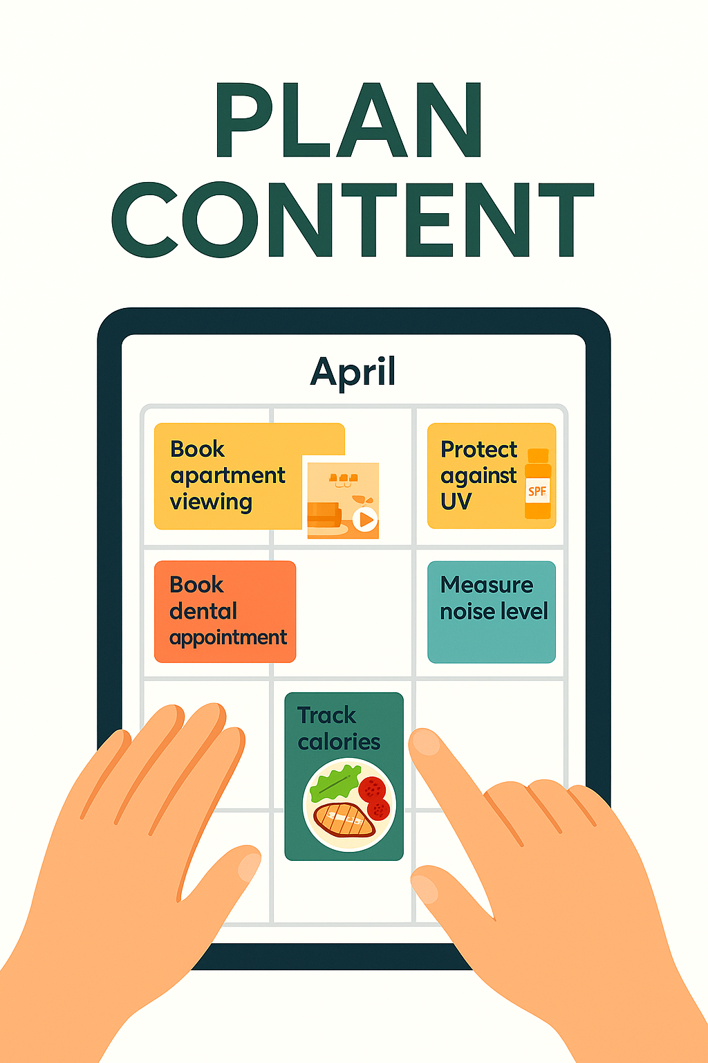 /Collection: /by davooda/Type: PNG/Digital content planning calendar for April with interactive elements, designed in a modern, colorful style. Ideal for personal organization and productivity tracking.