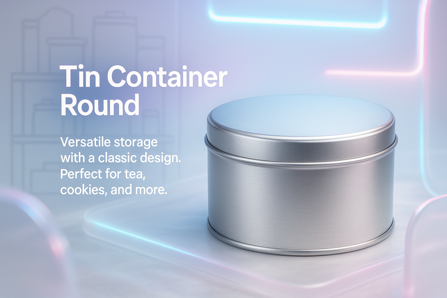 A visually appealing 3D render of a round tin container, showcasing its sleek design and versatility for storage. Ideal for product marketing in e-commerce.
