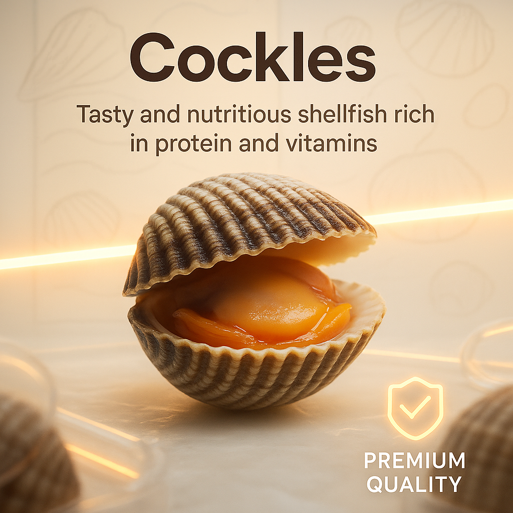 /Collection: /by davooda/Type: PNG/A visually appealing carousel slide featuring cockles, showcasing their premium quality. The design incorporates neon lighting and a balanced composition, emphasizing the product's nutritional benefits.