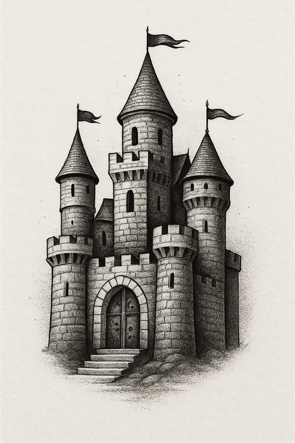 This image features a meticulously detailed black and white illustration of a medieval castle, showcasing its towers and stone structure. Suitable for fantasy themes or historical contexts.