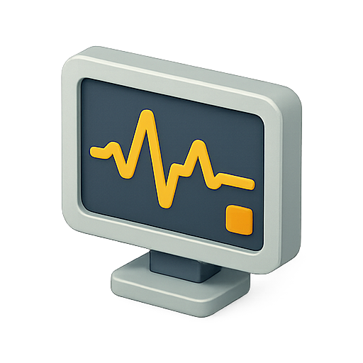Stylized 3D graphic of a computer monitor displaying a heartbeat line, ideal for health tech or medical applications. The design is modern and simplistic, making it suitable for digital media.