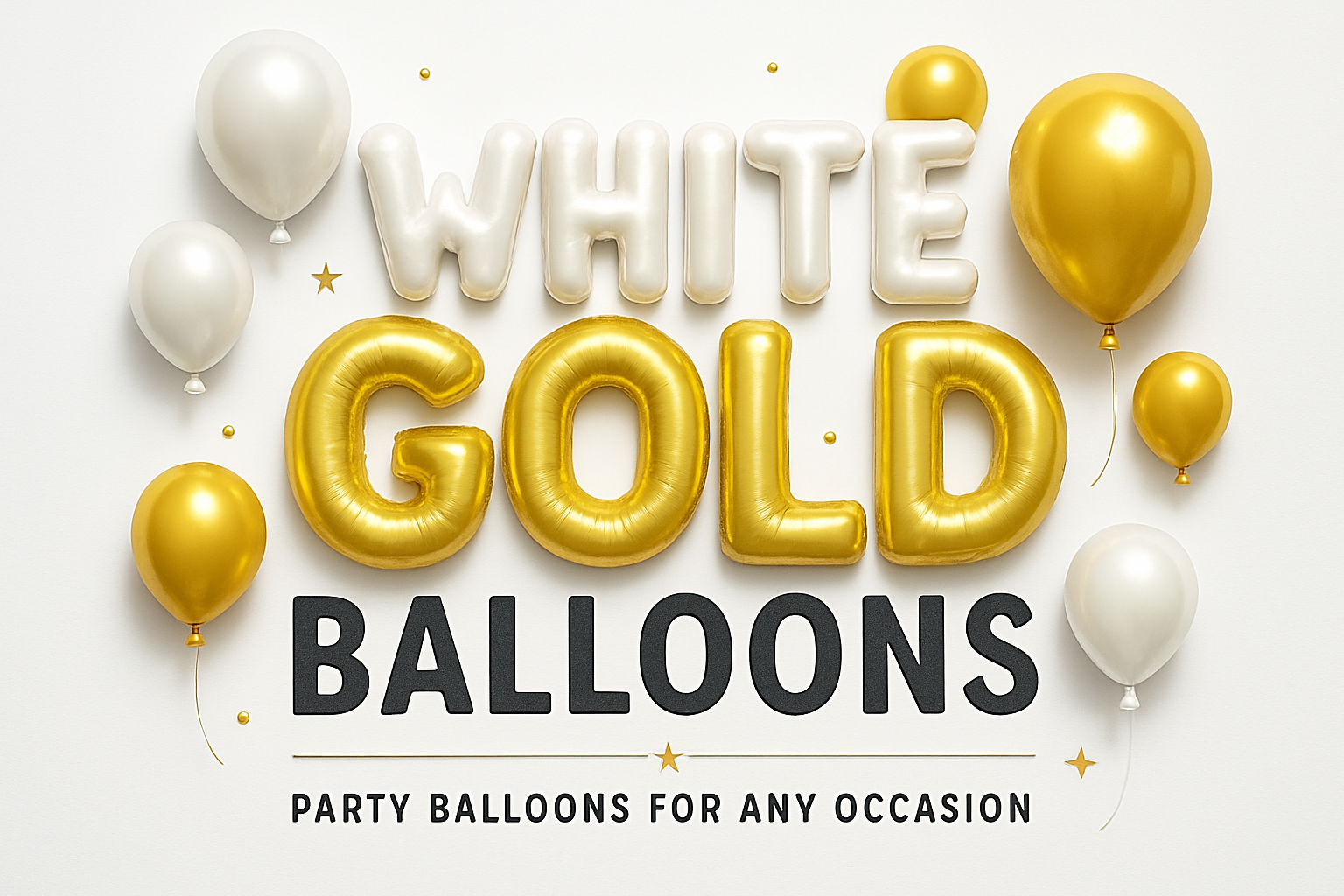 Vibrant graphic featuring inflated white and gold balloons with a playful typography, ideal for party invitations or decorations for celebrations.