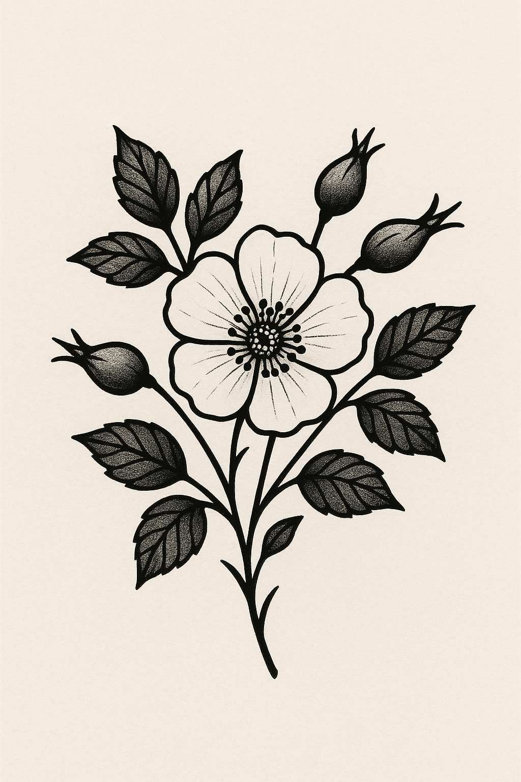A detailed black and white illustration of a flower and buds, suitable for art prints or botanical designs. The style is intricate and monochromatic.