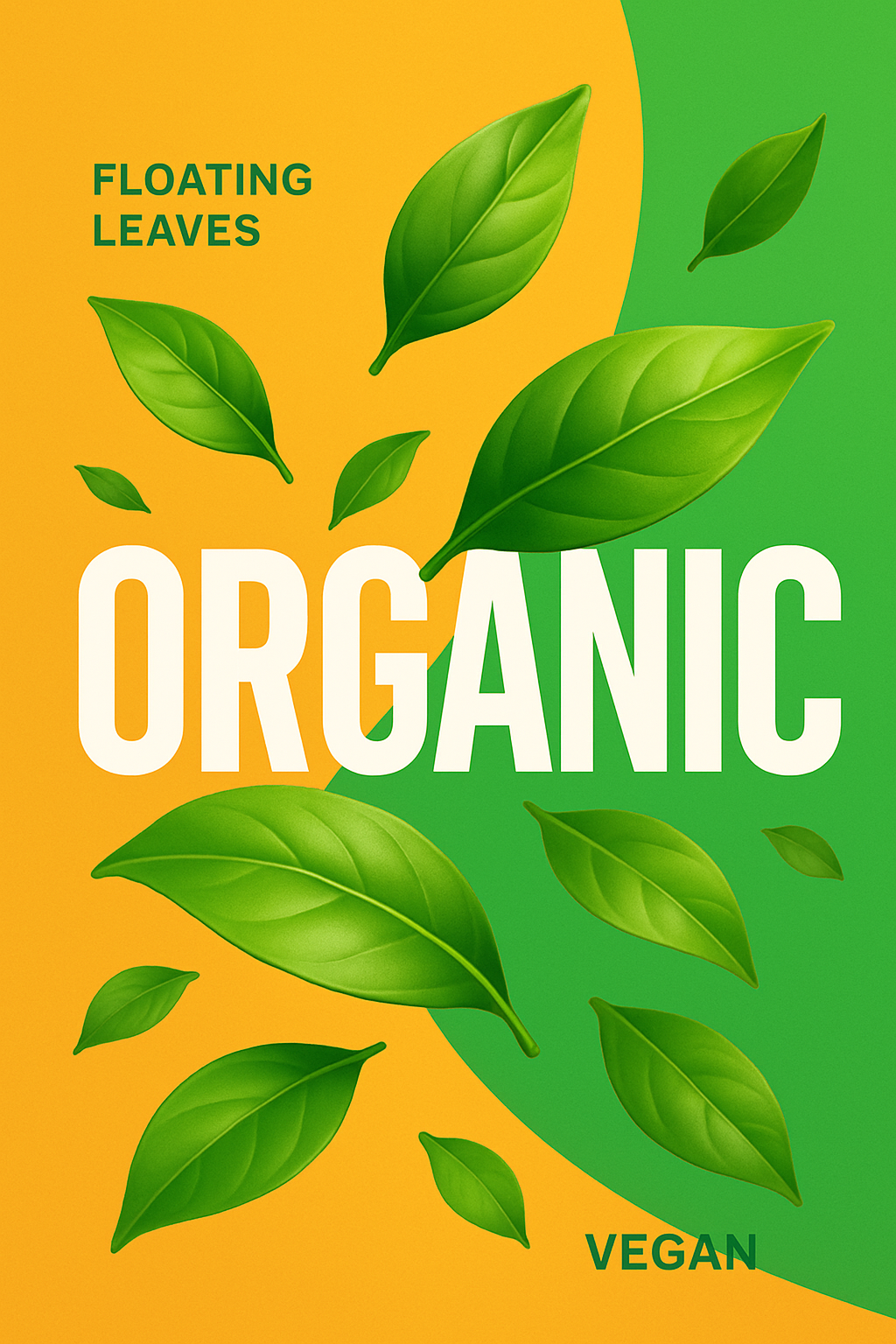 /Collection: /by davooda/Type: PNG/A vibrant illustration featuring floating green leaves against a bright background. The bold 'ORGANIC' text is prominent, conveying an eco-friendly theme. A modern and minimalistic design, ideal for beauty and vegan products.