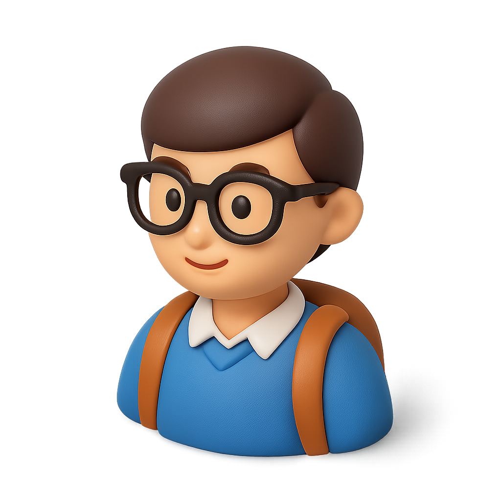 A charming 3D icon of a pupil character, featuring a boy with glasses and a backpack, designed in a playful and colorful style, set against a smooth gradient background.