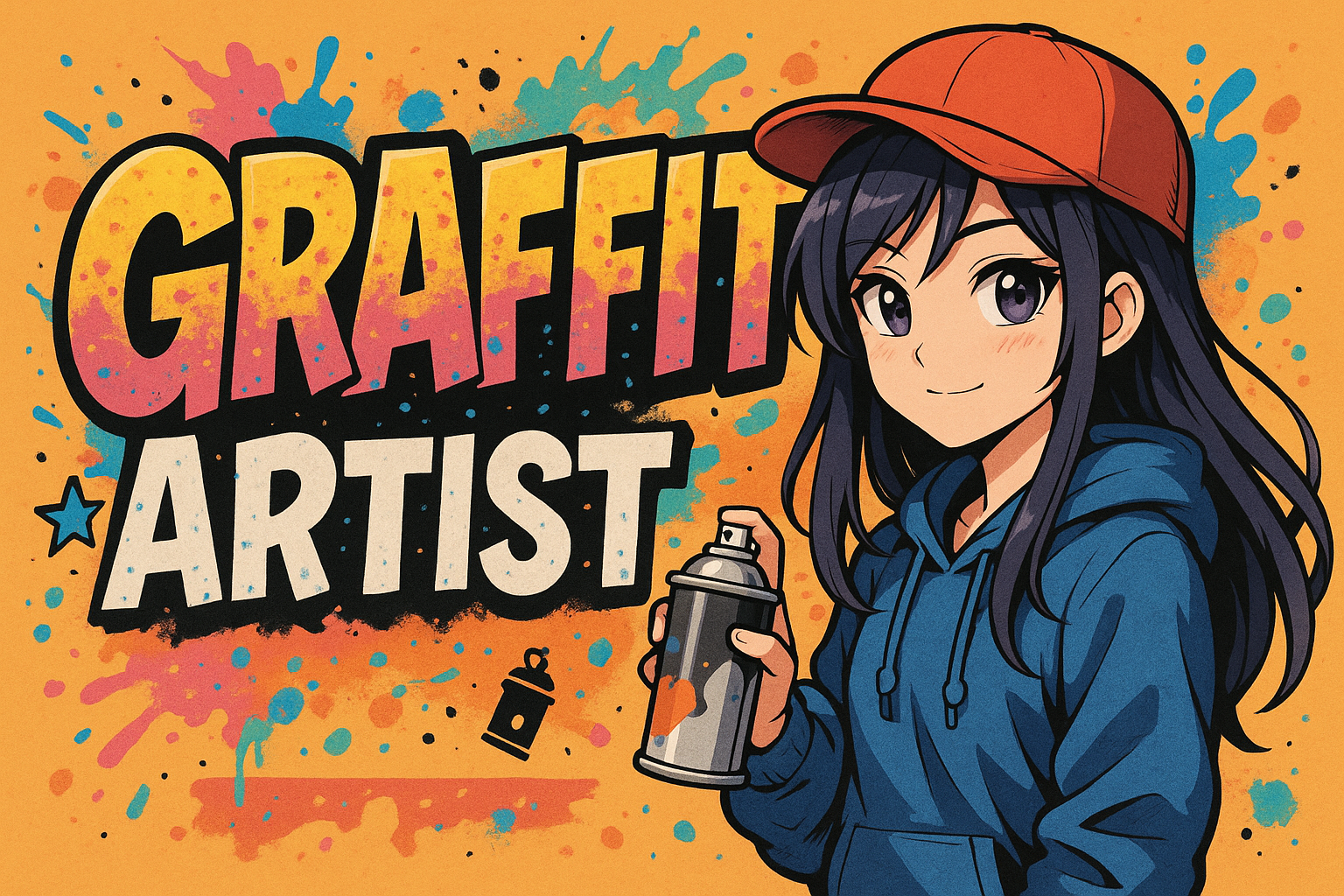 Colorful graphic featuring a stylized female graffiti artist holding a spray can, perfect for art-related promotions or events targeting youth culture.