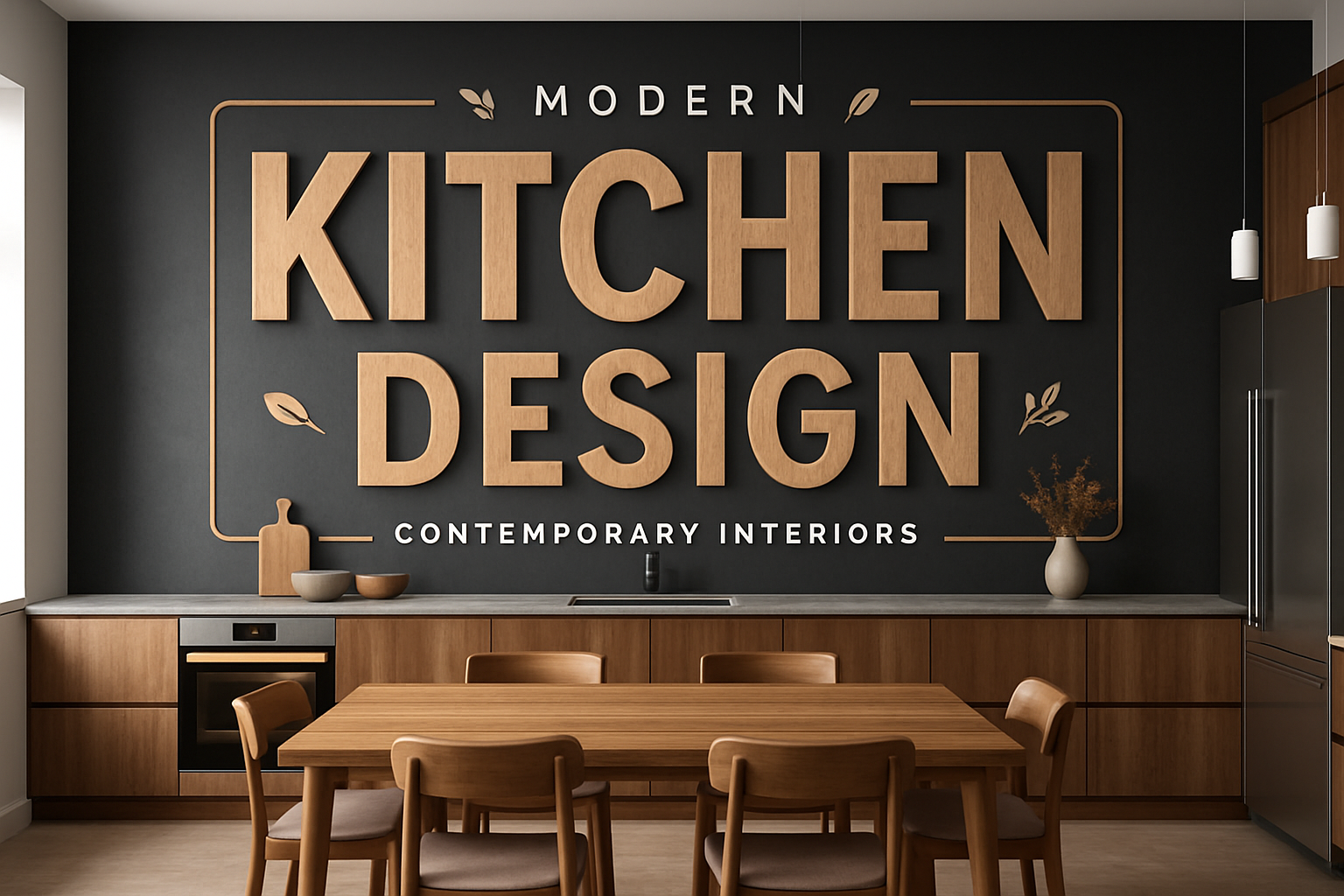 Stylish interior design image featuring a modern kitchen with bold wooden typography on a dark wall. Ideal for home decor marketing and design inspiration.