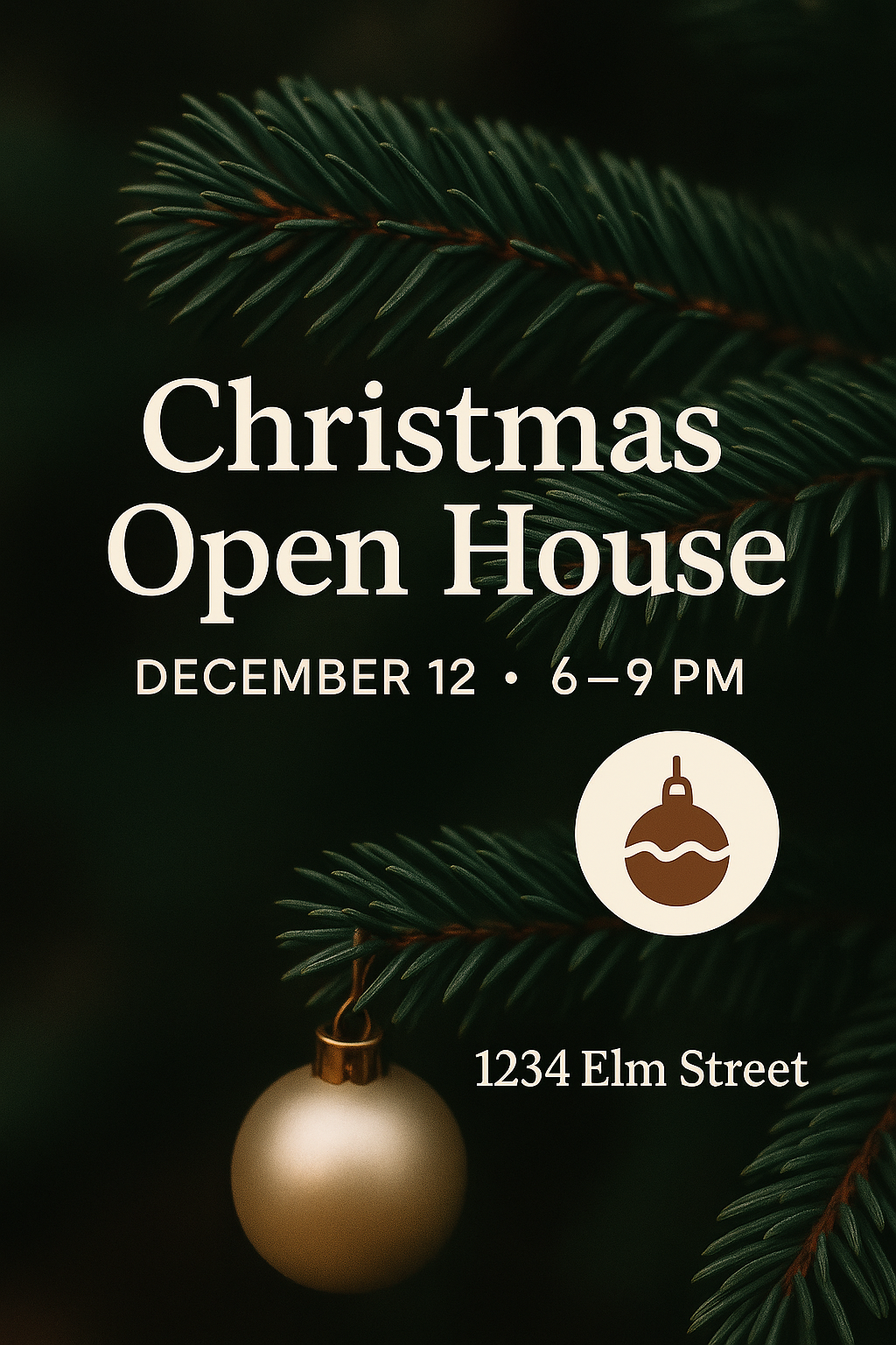 /Collection: /by davooda/Type: PNG/Stylish invitation graphic for a Christmas Open House, featuring a decorative ornament and botanical elements, ideal for holiday gatherings and community events.