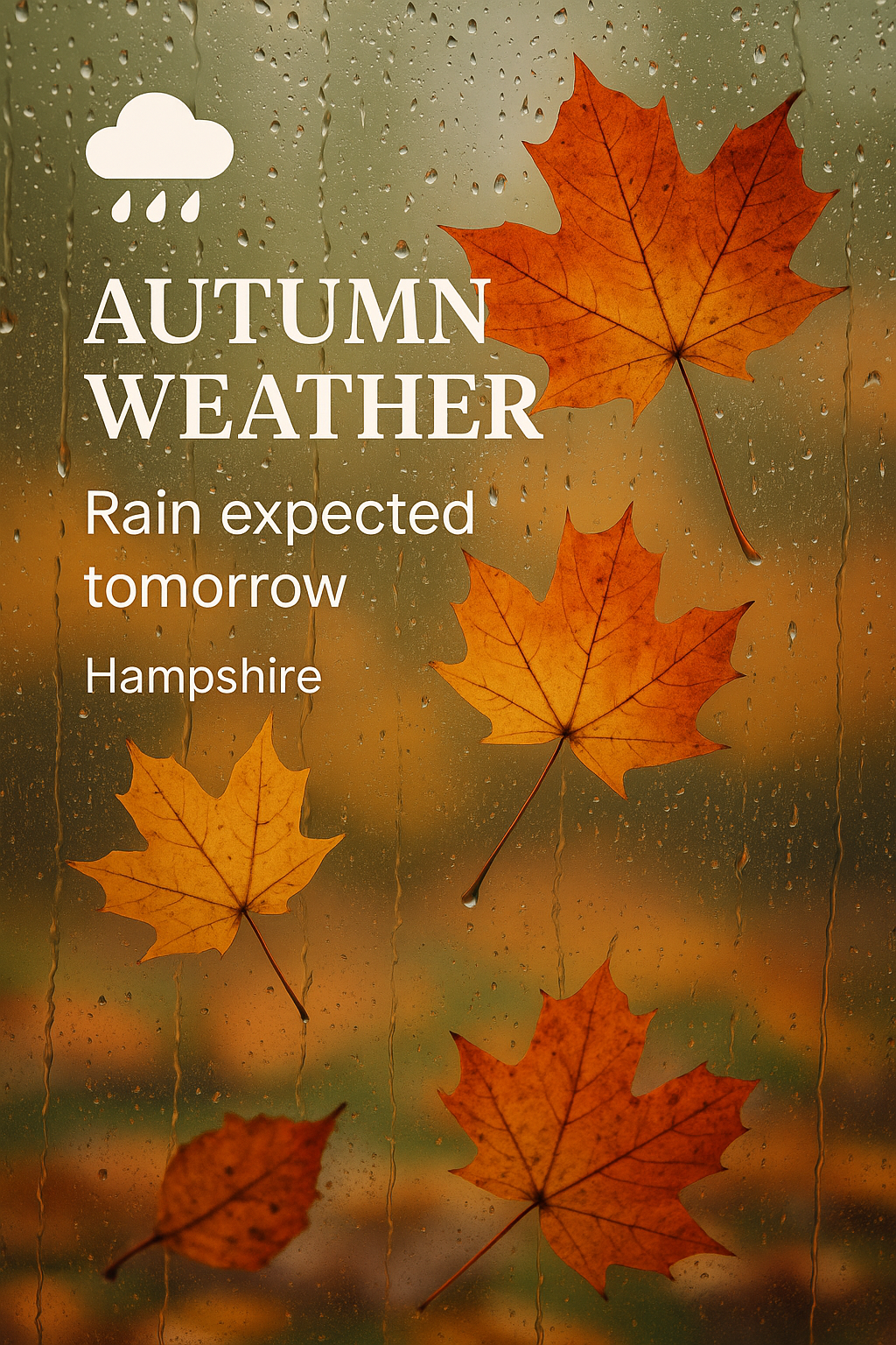 Stylish seasonal announcement graphic featuring falling leaves and rain imagery, ideal for weather updates and social media sharing.