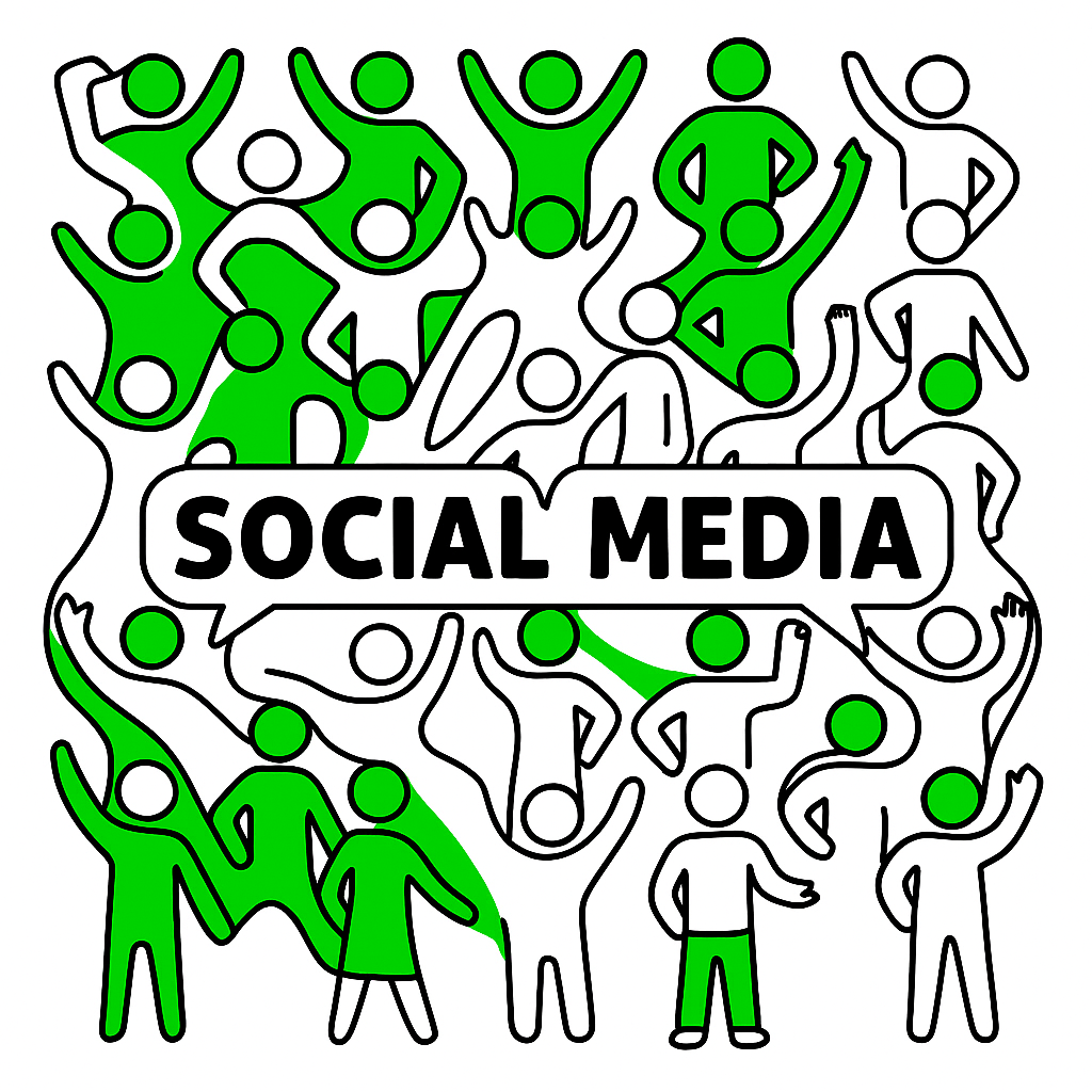 /Collection: /by davooda/Type: PNG/Vibrant illustration depicting diverse figures in dynamic poses, symbolizing social media interaction and engagement. Suitable for marketing materials and online platforms.