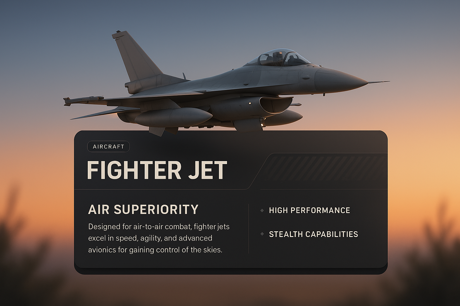 A sleek 3D illustration of a fighter jet against a gradient sunset background. The design features integrated text blocks detailing performance and capabilities.
