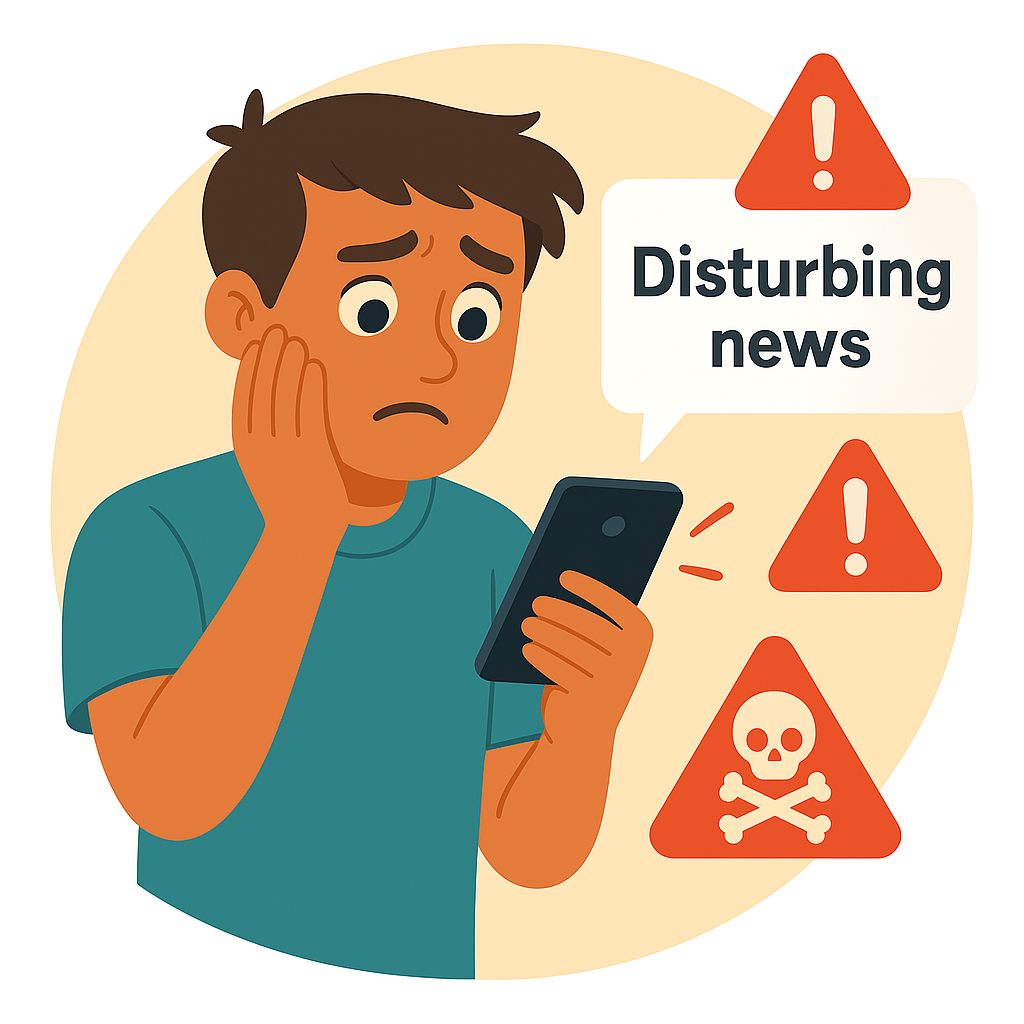 /Collection: /by davooda/Type: PNG/A digital illustration depicting a young person looking shocked while reading disturbing news on their smartphone. The style is colorful and cartoonish, ideal for social media or blog content addressing current events or mental health.
