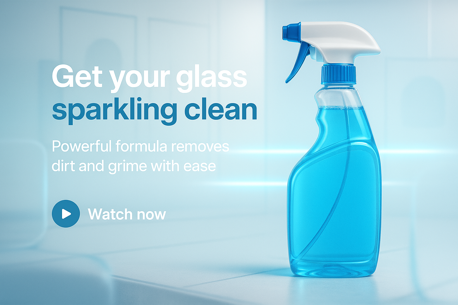 /Collection: /by davooda/Type: PNG/A visually appealing promotional image showcasing a blue glass cleaner spray bottle. Designed for advertising, it highlights product features with a modern, clean aesthetic aimed at consumers looking for effective cleaning solutions.