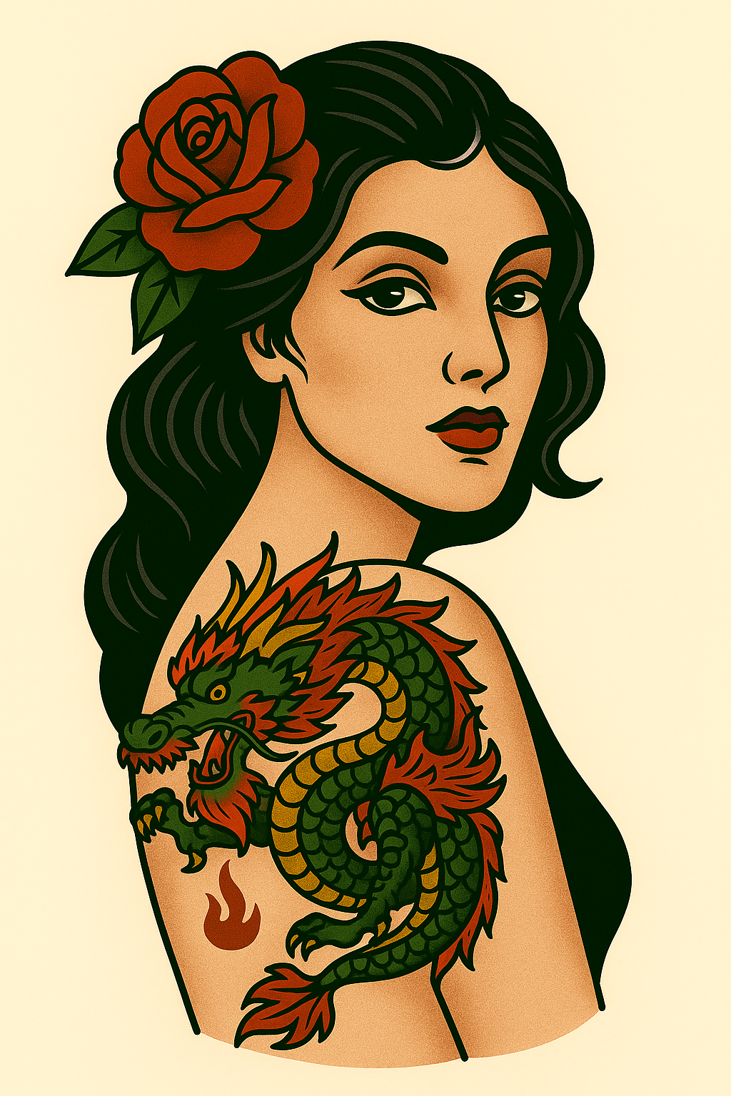 Vibrant tattoo illustration depicting a woman with a dragon tattoo and a rose in her hair. Ideal for tattoo design inspiration and artistic showcases.