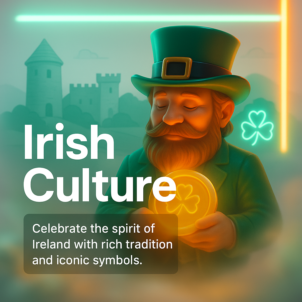 /Collection: /by davooda/Type: PNG/Vibrant digital illustration showcasing elements of Irish culture, featuring a leprechaun and traditional symbols, ideal for cultural celebrations and events.