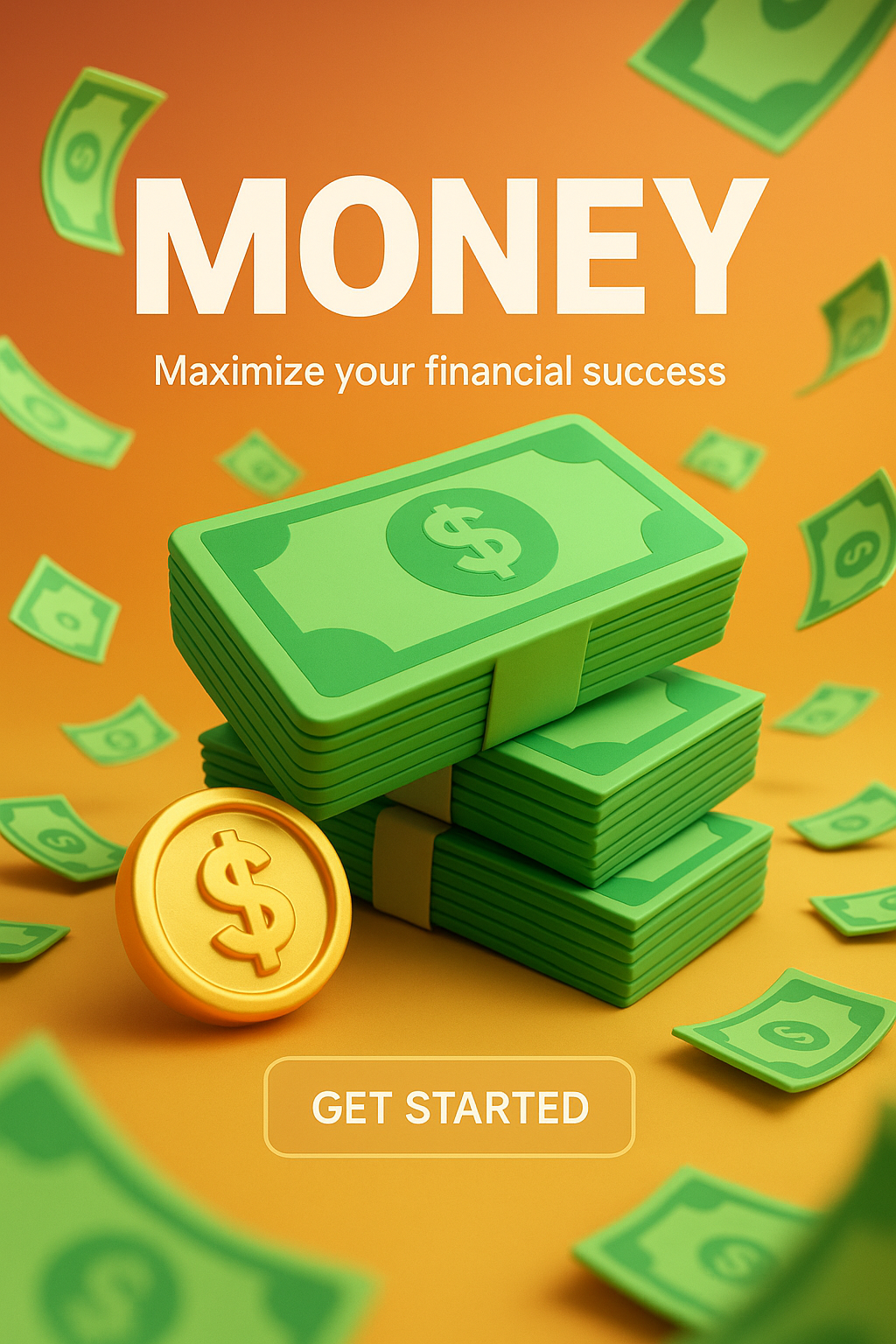 Vibrant 3D graphic representing financial success with stacks of money and coins, ideal for promotional materials aimed at financial services or investment opportunities.