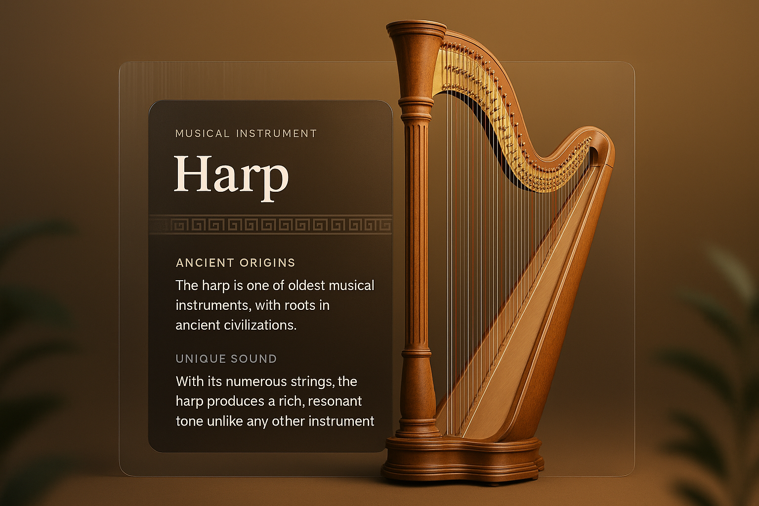 /Collection: /by davooda/Type: PNG/A stunning 3D illustration of a harp, featuring integrated design elements like a dark, transparent panel with text. The background transitions smoothly with a gradient, enhancing the harp's elegance.