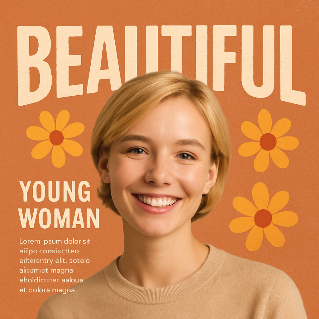 /Collection: /by davooda/Type: PNG/Vibrant social media graphic showcasing a young woman with a warm smile against a textured orange background, complemented by floral elements. Ideal for personal branding or lifestyle content.