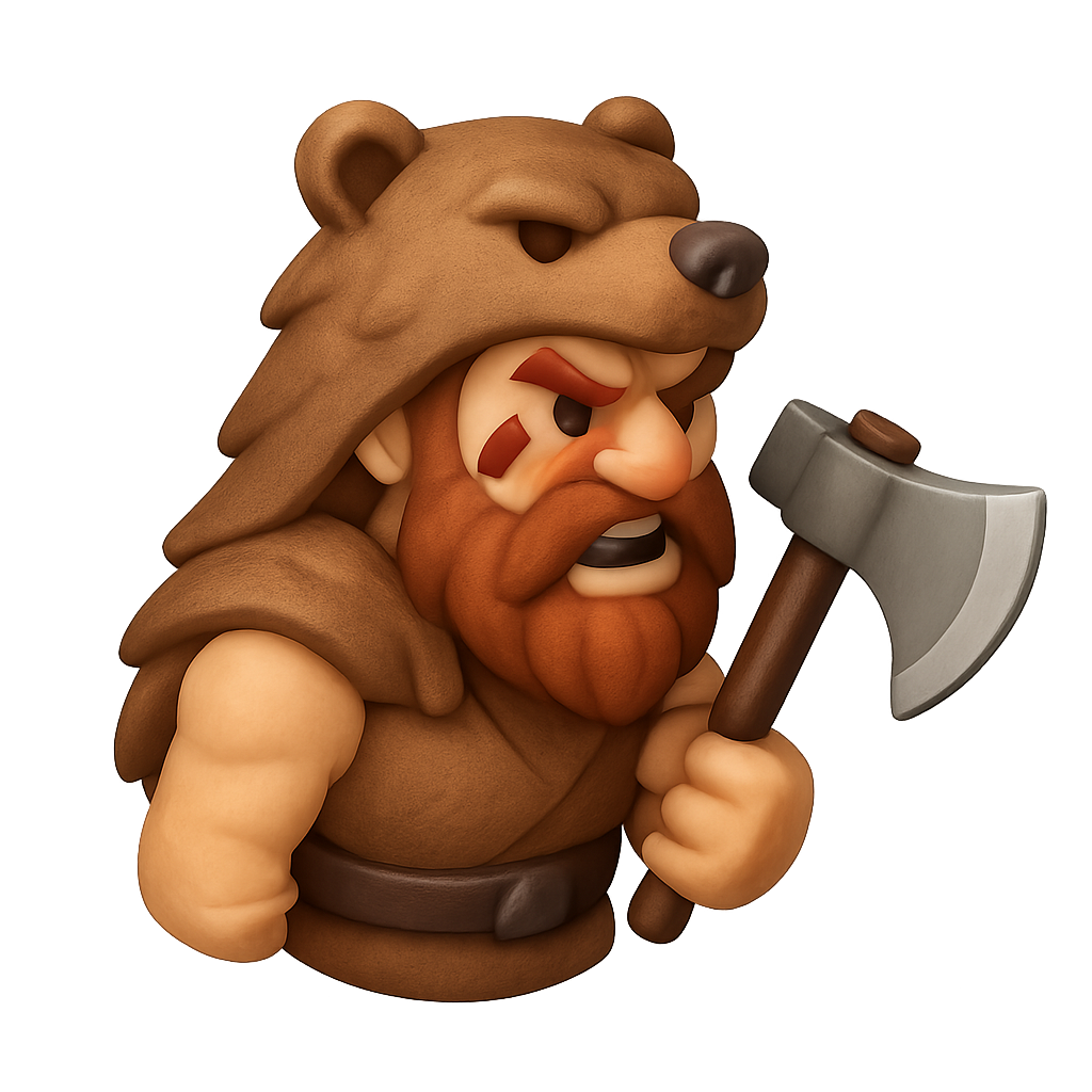 A stylized 3D icon of a Norse berserker wearing a bear hood, holding an axe. The character features a fierce expression and is designed with a volumetric, isometric perspective.