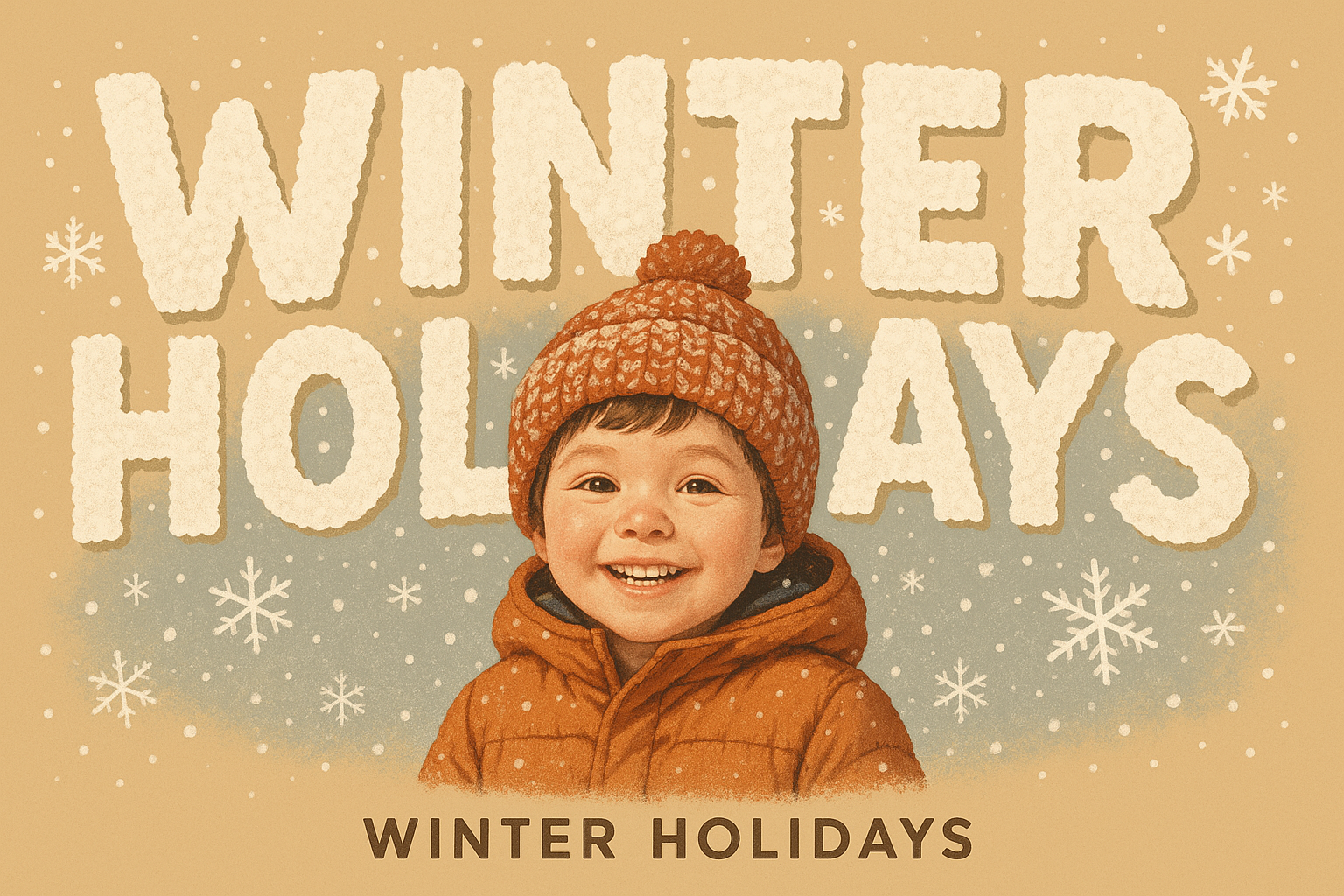 /Collection: /by davooda/Type: PNG/Charming winter holidays illustration showcasing a young child in a cozy outfit, with bold, textured typography and a warm color palette, ideal for holiday promotions.