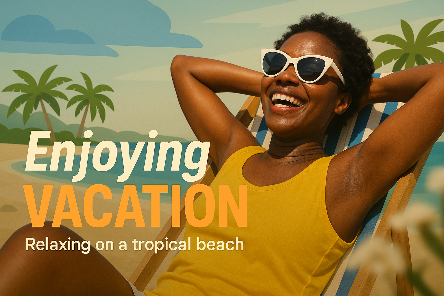 /Collection: /by davooda/Type: PNG/Vibrant image of a woman enjoying her vacation on a tropical beach, radiating happiness. The scene captures the essence of relaxation with a bright color palette and sunny atmosphere, ideal for travel and leisure marketing.