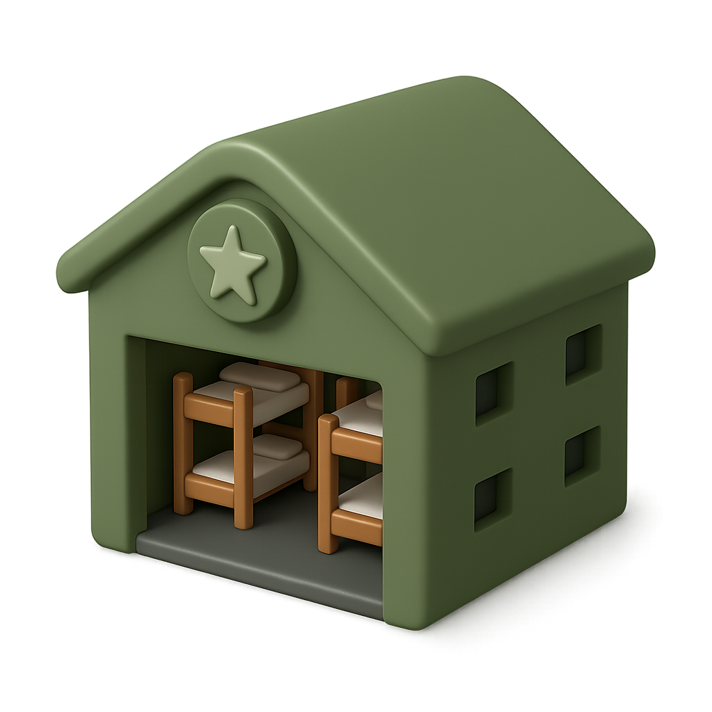 A green, stylized 3D icon of a barracks structure featuring a star emblem, open front, and visible beds. The icon has a smooth, modern design with a volumetric feel.
