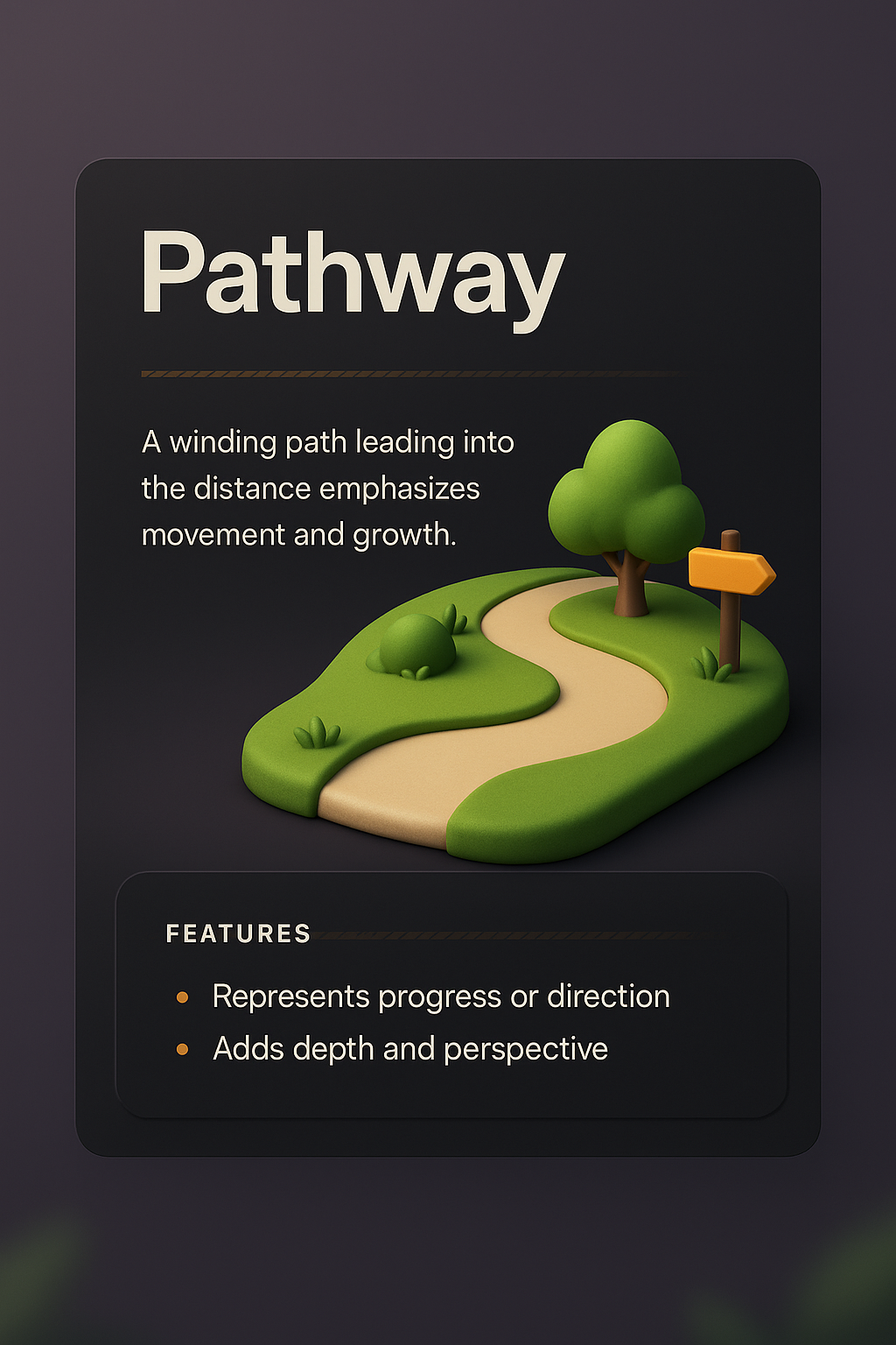 A 3D illustration featuring a winding pathway surrounded by greenery. The design includes a signpost and emphasizes themes of movement and growth, with a modern aesthetic.