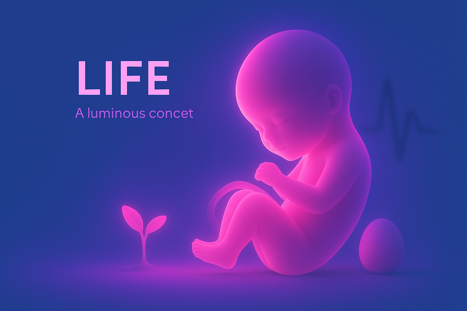 A serene composition depicting a glowing figure representing life, surrounded by a plant and an egg. The soft neon pink light radiates against a solid blue background, creating a tranquil atmosphere.