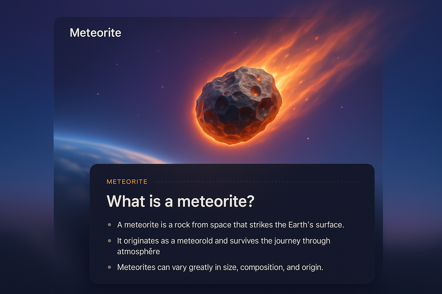 A captivating 3D illustration of a meteorite soaring through space, integrated with informative text blocks outlining its characteristics and journey.