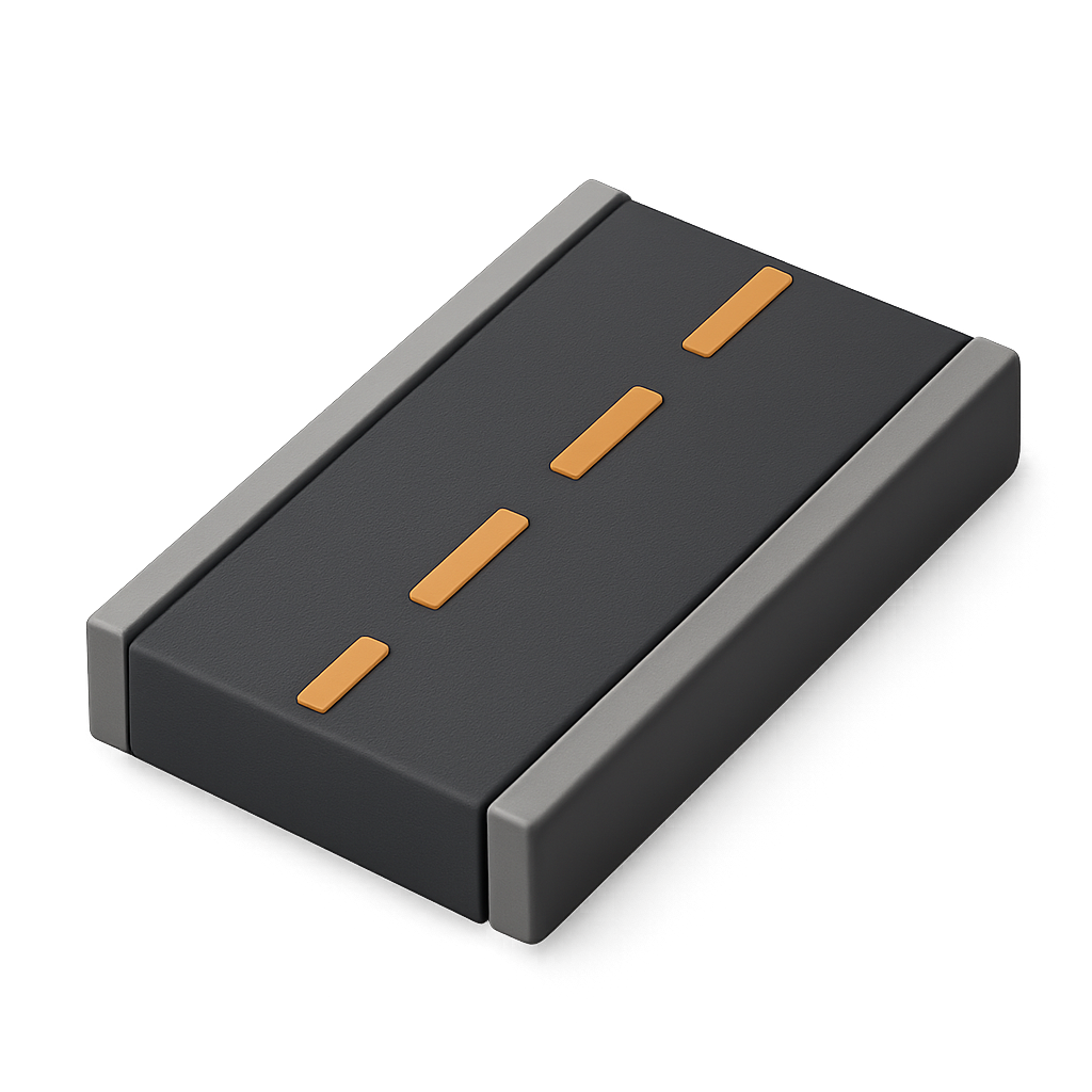 A sleek 3D representation of a road icon, featuring a dark asphalt texture with orange lane markings. The design showcases a three-quarter isometric view, enhancing its volumetric effect.