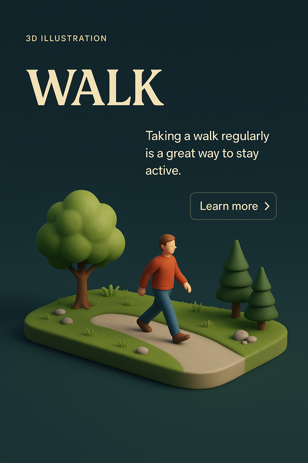 /Collection: /by davooda/Type: PNG/A stylized 3D illustration depicting a person walking on a path surrounded by trees. The dark gradient background enhances the vibrant colors of the scene, creating a visually appealing design.