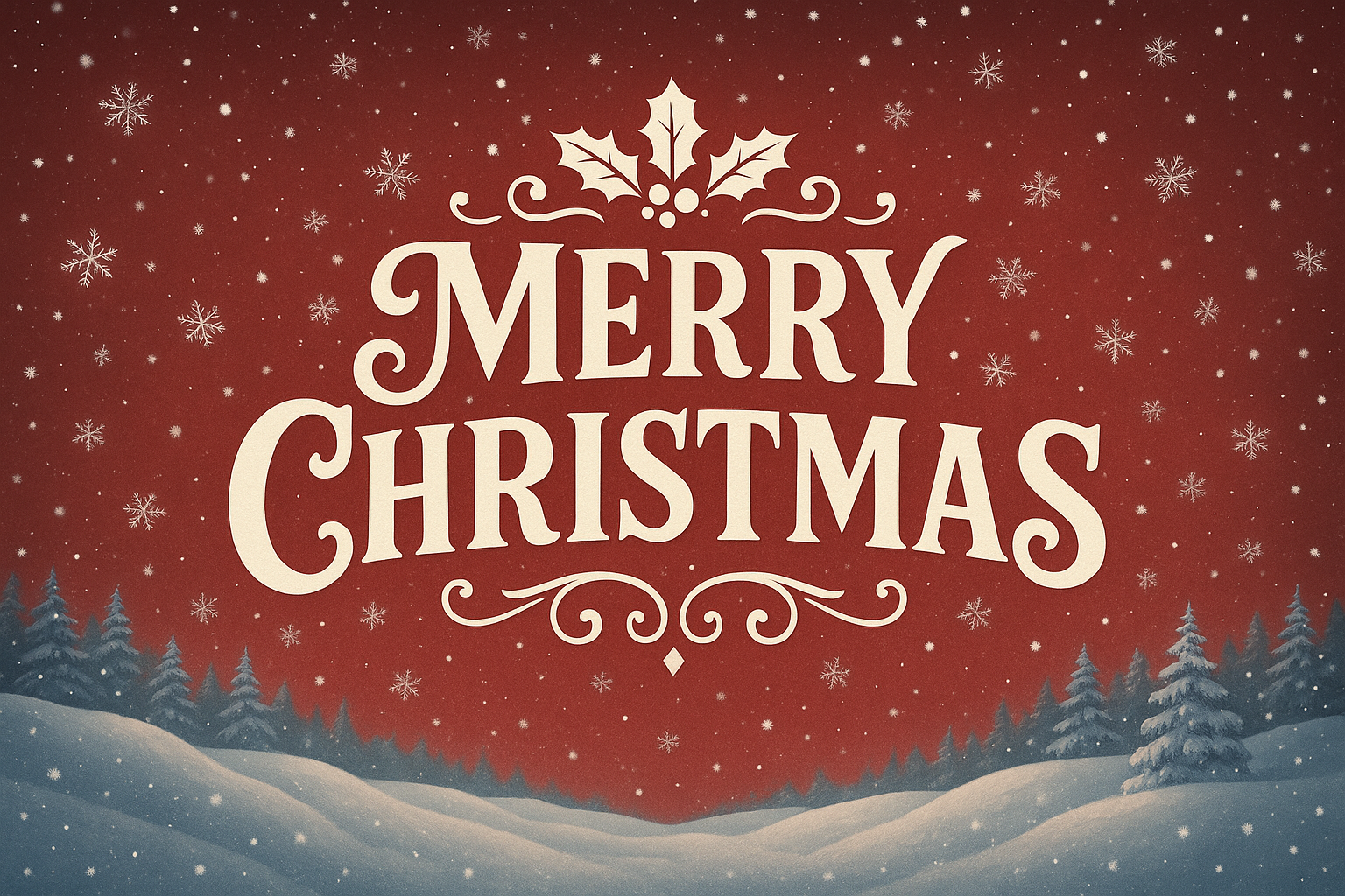 A warm and inviting Christmas greeting card featuring elegant typography against a snowy landscape, ideal for holiday wishes and seasonal promotions.