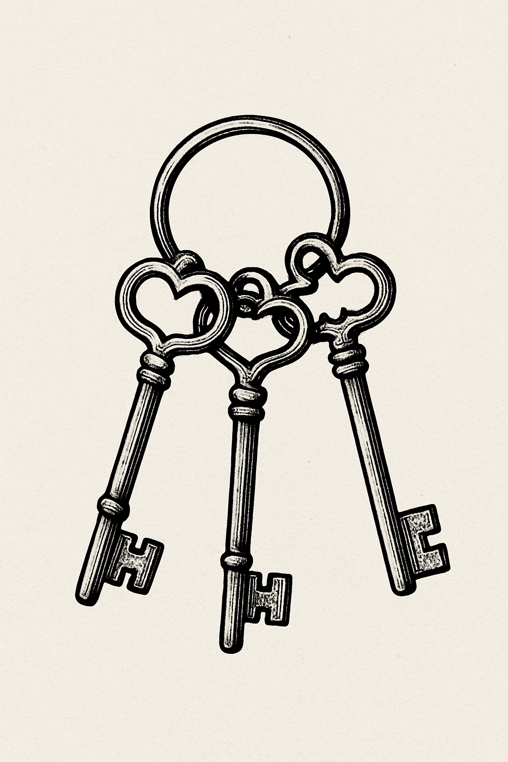 This image features a vintage-style illustration of three ornate keys attached to a ring. It has a minimalist design with a neutral background, suitable for decorative or thematic use.