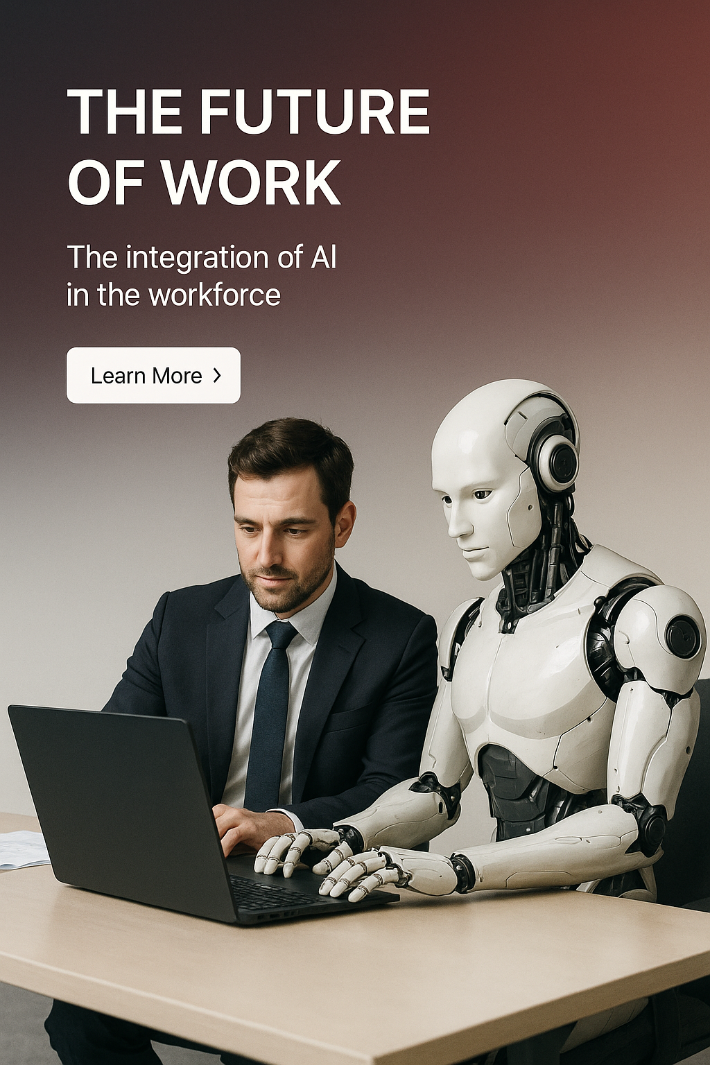 /Collection: /by davooda/Type: PNG/A businessman works alongside an AI cyborg in a sleek office, showcasing the future of work and technology integration, with a gradient background and clear text elements.
