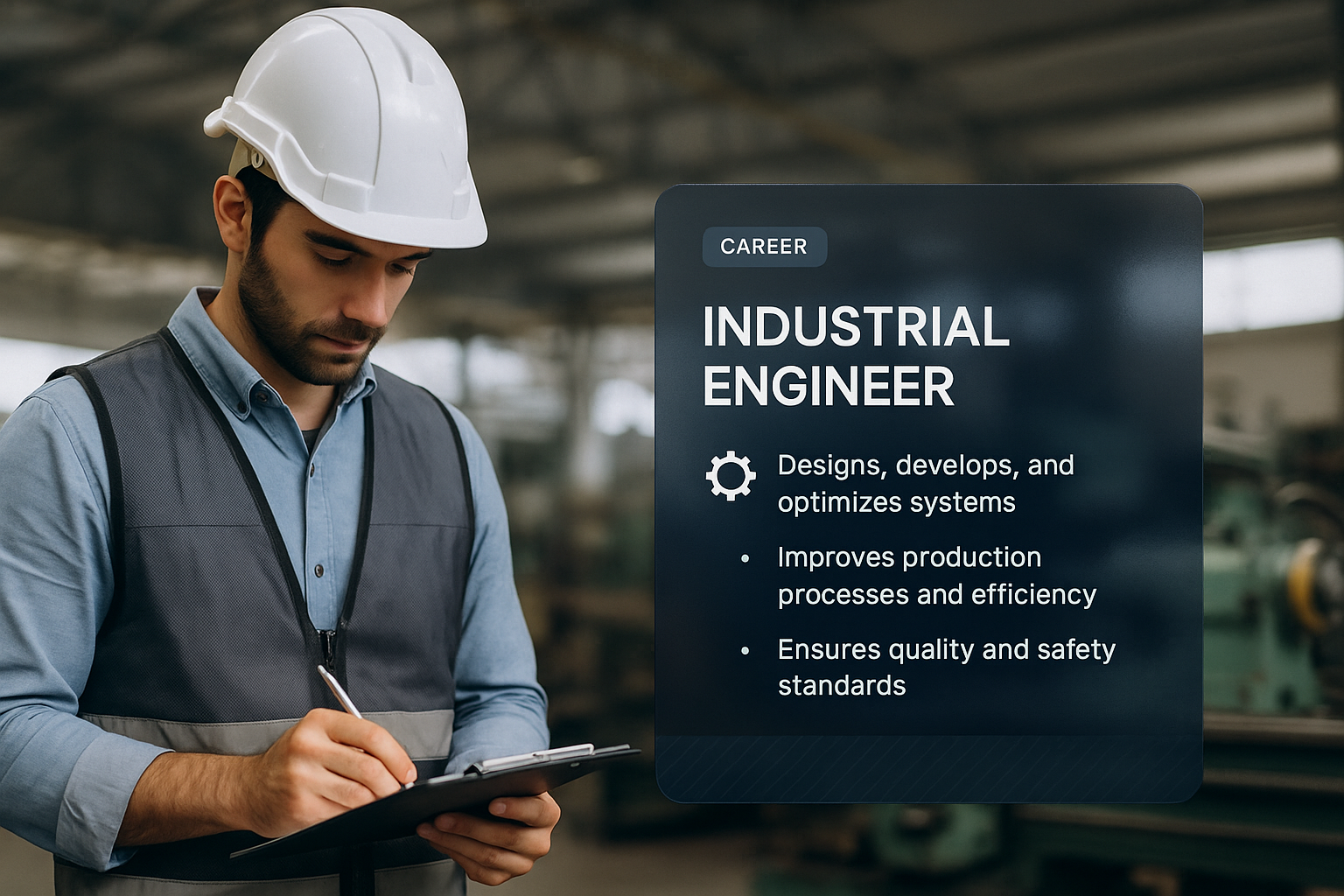The image features an industrial engineer in a workshop, focused on his work. A stylish panel outlines his role, emphasizing design and optimization skills.