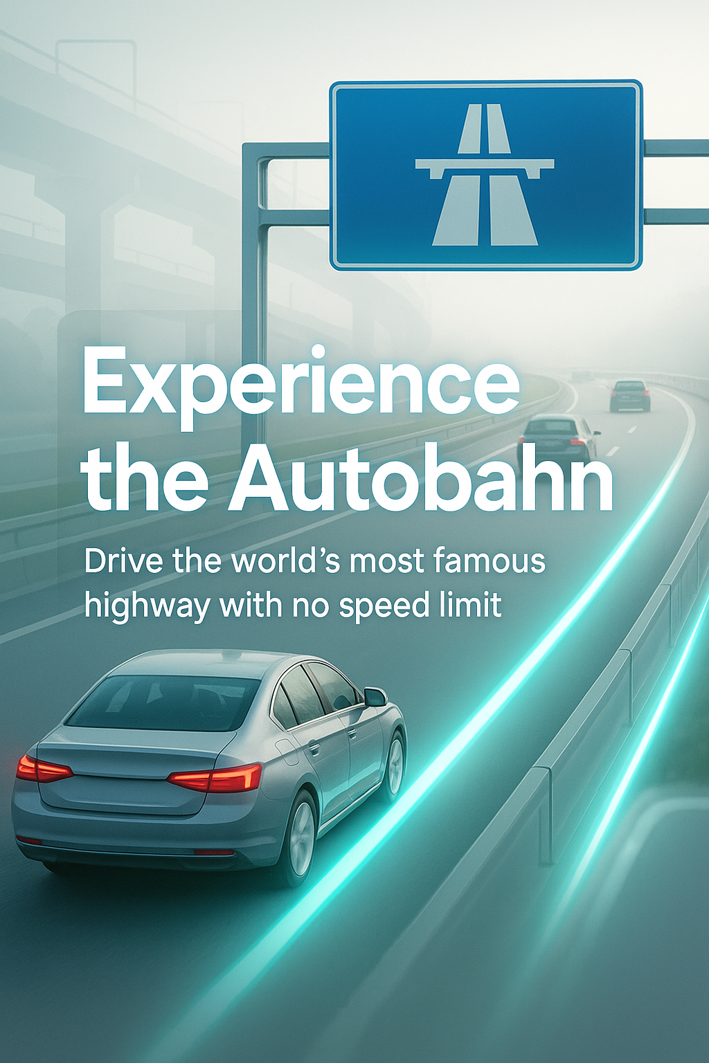A visually engaging promotional image depicting a car on the Autobahn, emphasizing the thrill of driving without speed limits. Ideal for travel campaigns.