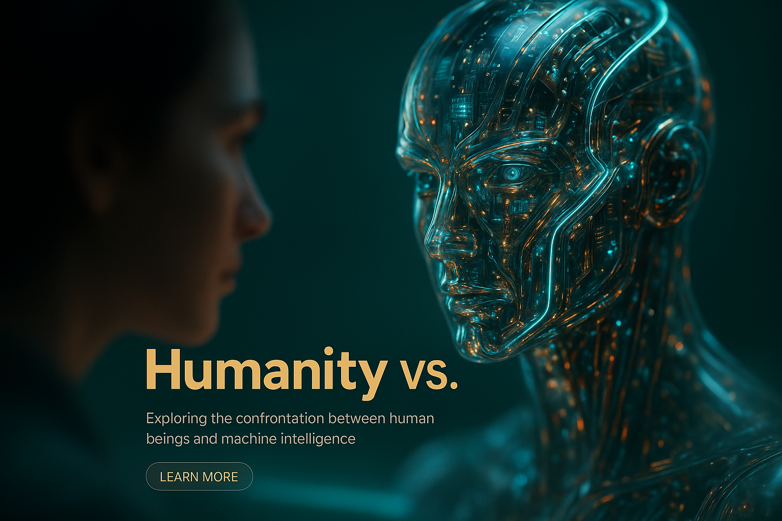 /Collection: /by davooda/Type: PNG/A striking visual representation of the confrontation between humanity and AI. The image features a hyperrealistic close-up of a translucent AI figure with glowing internal circuits, set against a blurred human silhouette, creating a profound depth.