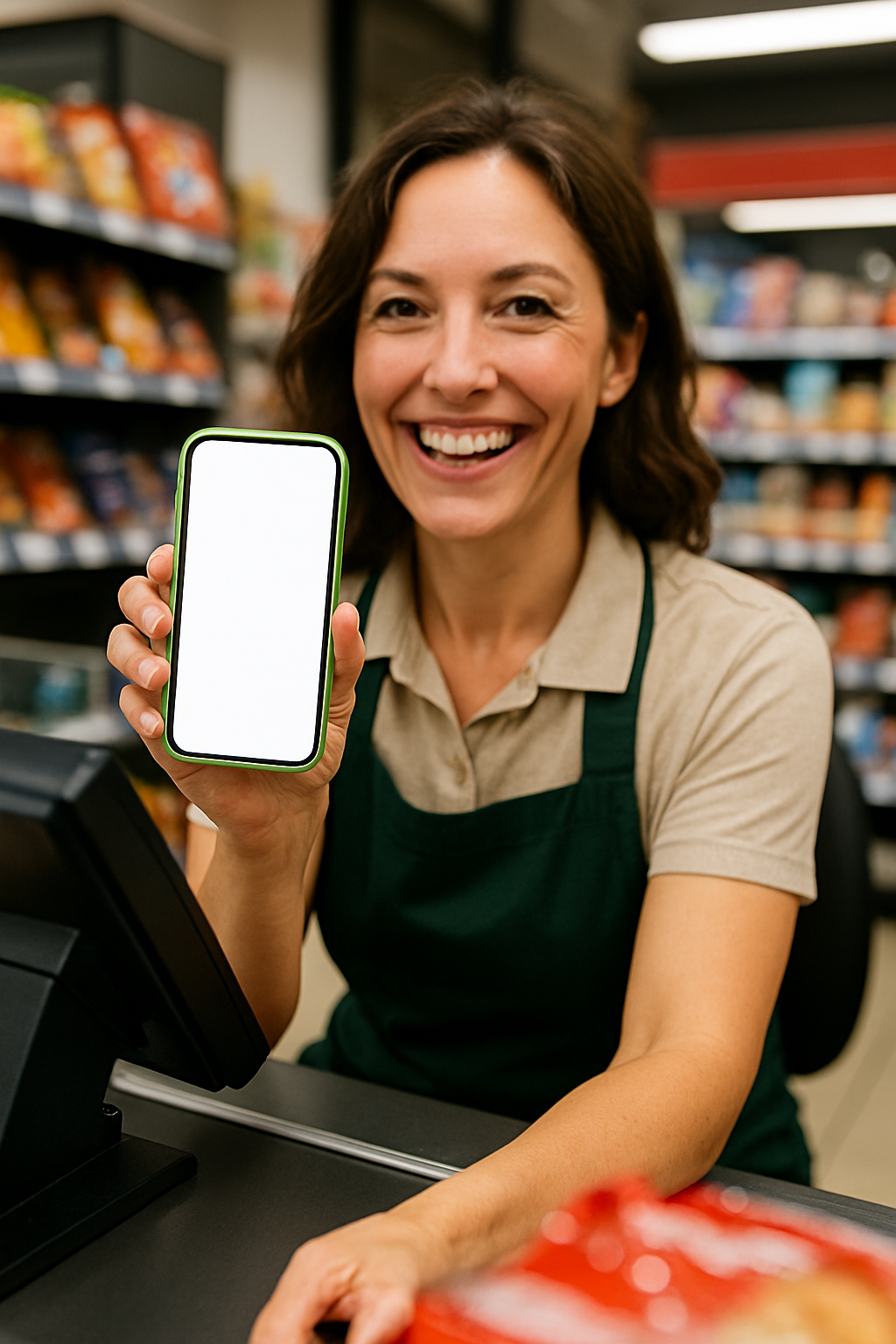 A cheerful cashier holds a green payment phone with a blank screen, showcasing a friendly demeanor. The store's shelves filled with products are visible in the background.