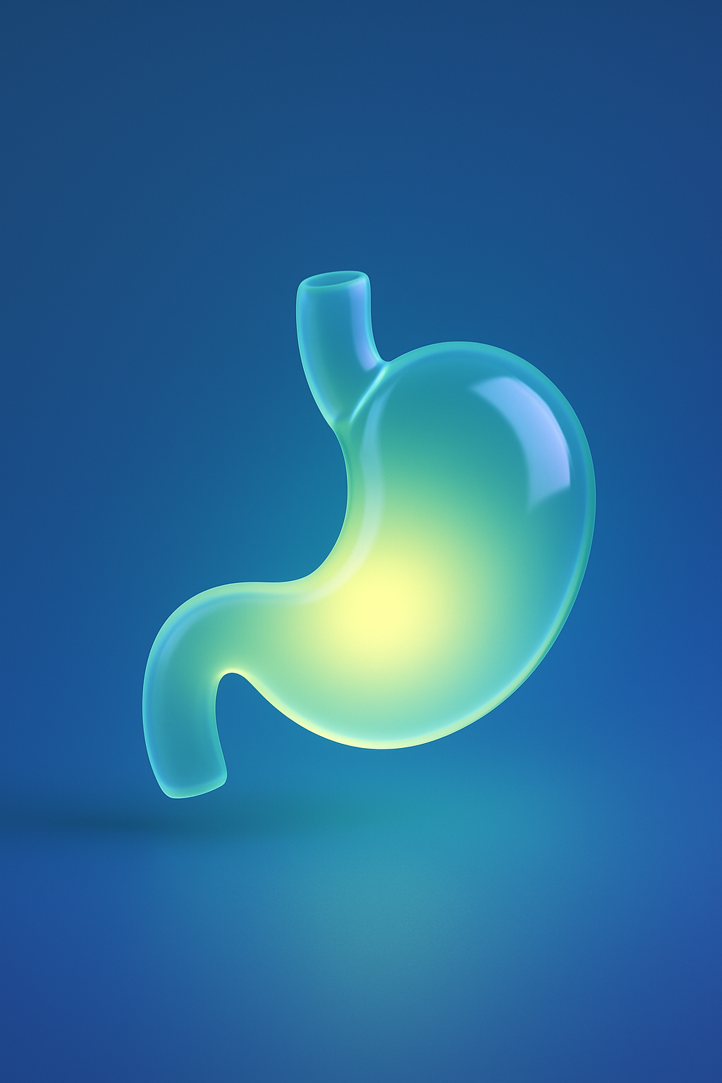/Collection: /by davooda/Type: PNG/A realistic 3D icon of a stomach rendered in a light yellow-green and blue color scheme. The composition features a glowing area and semi-transparent glass effect, creating a soft illumination against a solid blue background.