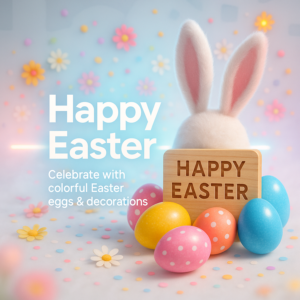 Vibrant Easter-themed graphic featuring a bunny, colorful eggs, and festive decorations, perfect for social media posts or greeting cards.