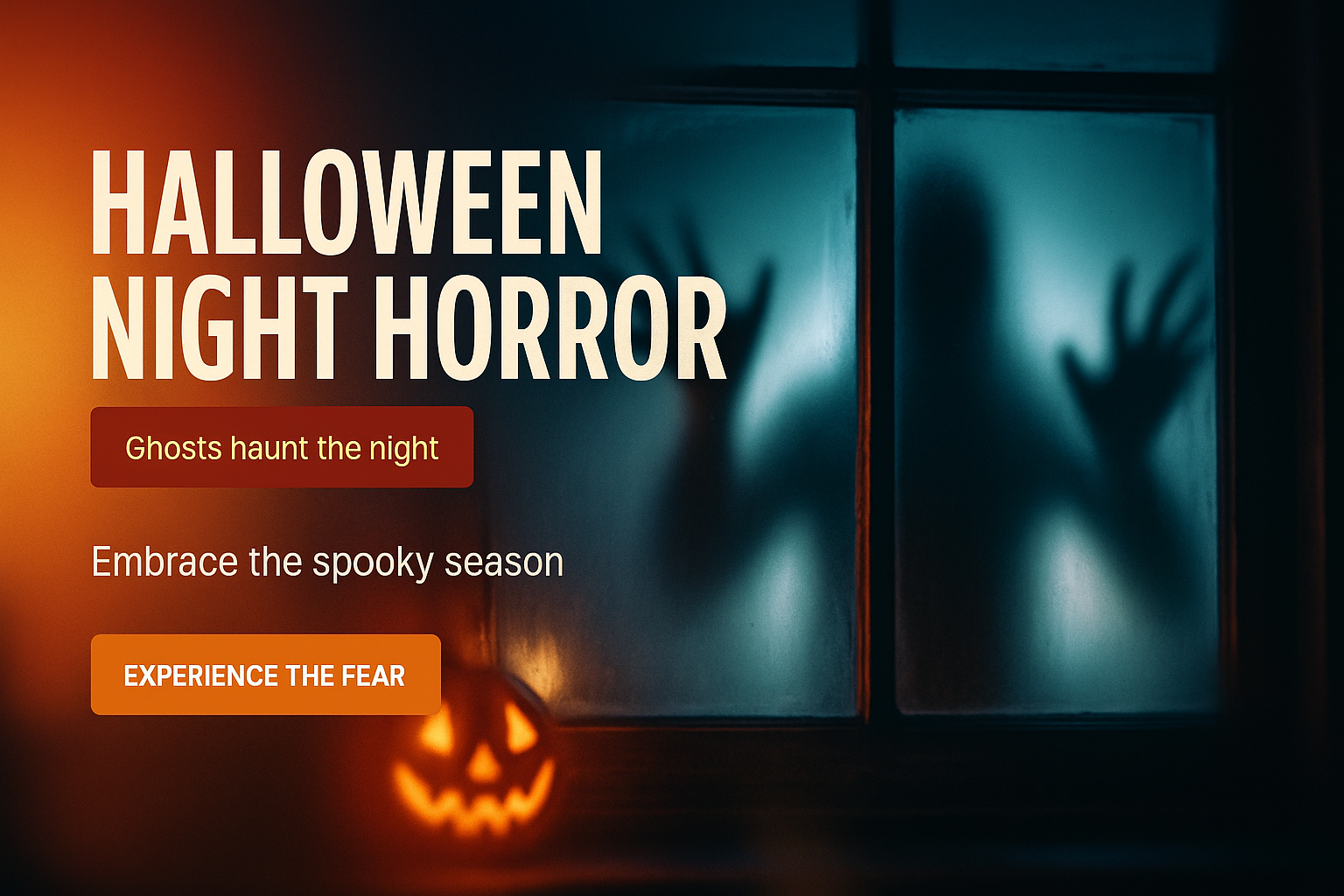 /Collection: /by davooda/Type: PNG/A haunting bedroom window scene features a blurred ghostly silhouette against a vibrant backdrop. The eerie atmosphere is accentuated by a glowing pumpkin, embodying Halloween's spooky essence.