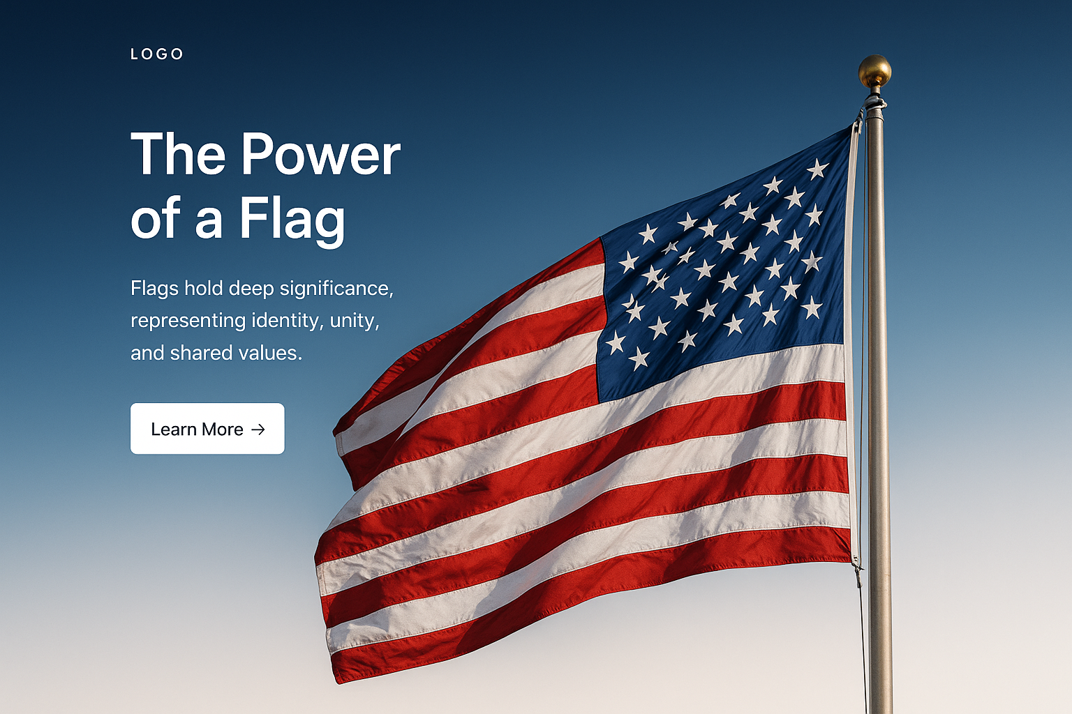 A stylish web page mockup showcasing an American flag with a gradient background. Features a logo, a headline, a text block, and a call-to-action button.