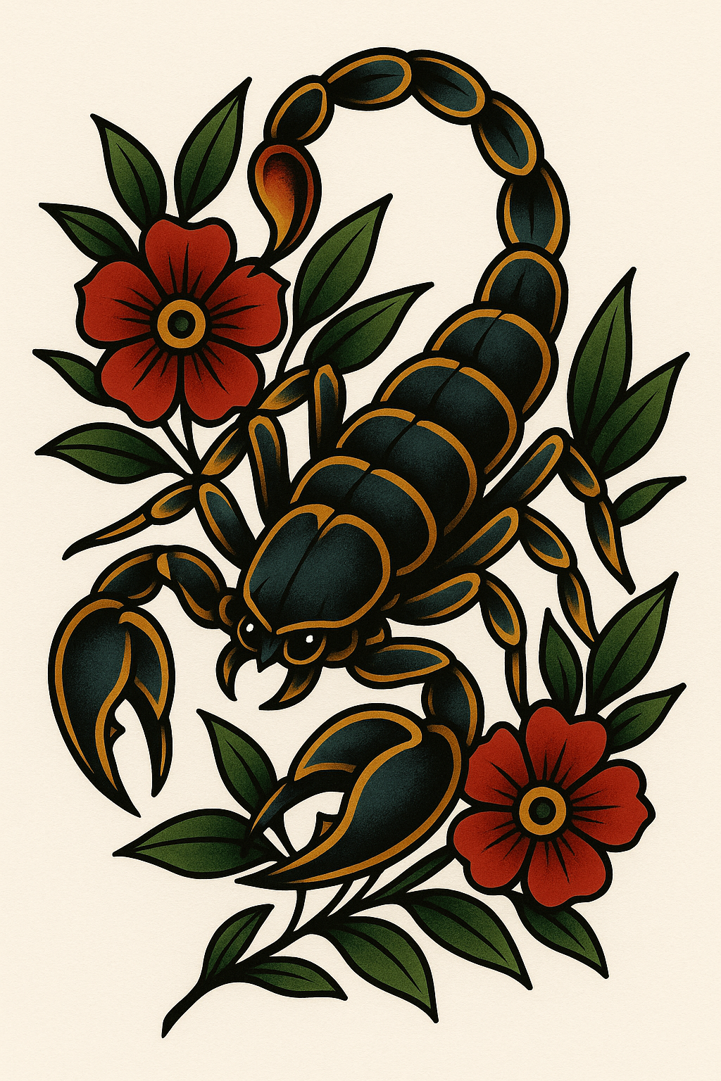 A vibrant tattoo illustration featuring a bold scorpion surrounded by colorful flowers and leaves, ideal for tattoo enthusiasts and design inspiration.